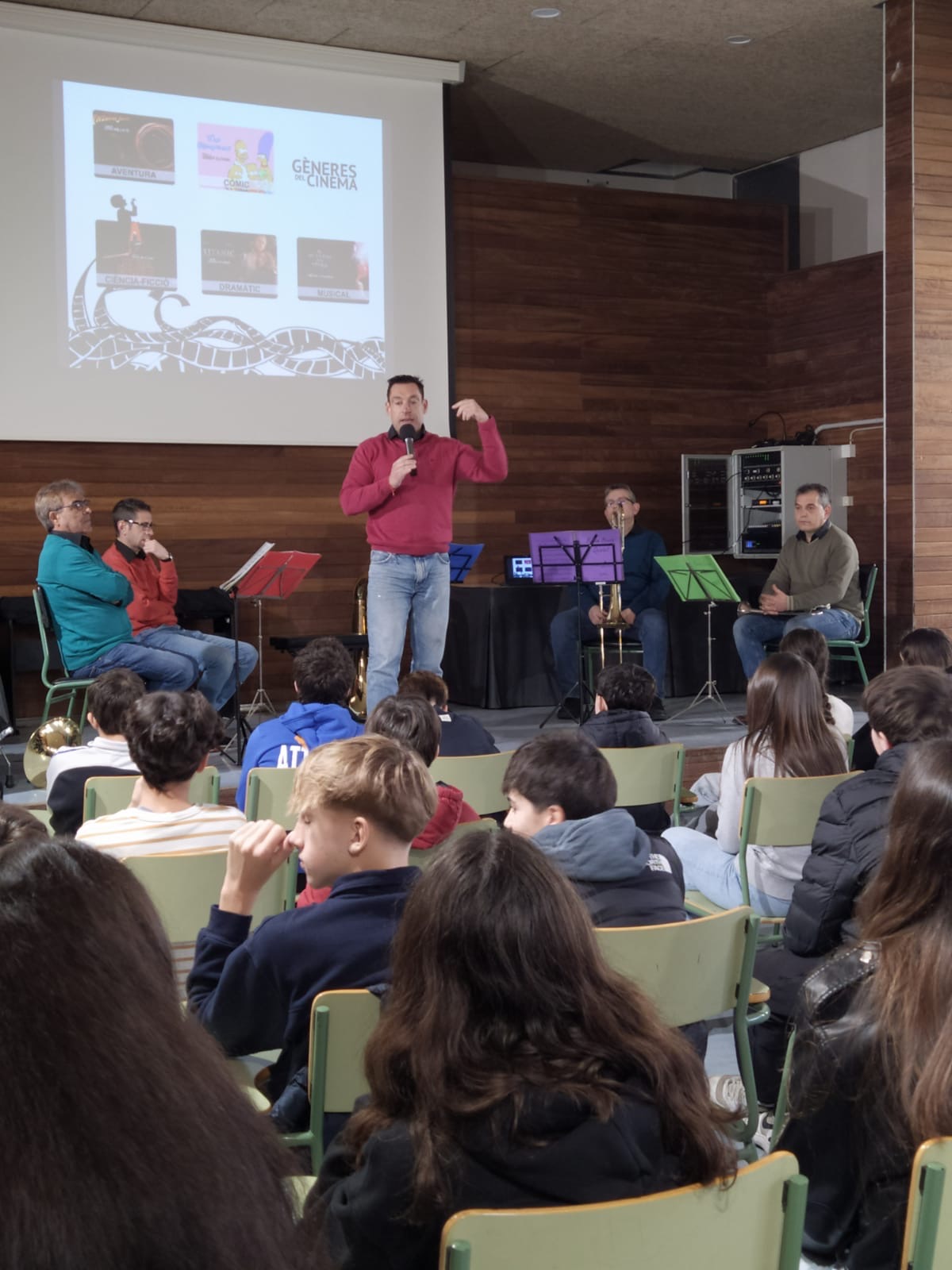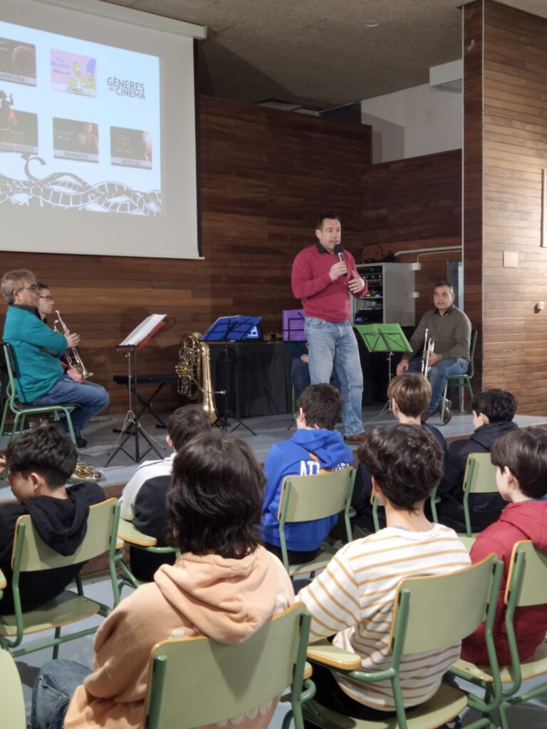 L’activitat va reunir a tots els alumnes de 2n d’ESO a la sala d’actes de l’institut i van recórrer la història del cinema a través de la seva música.