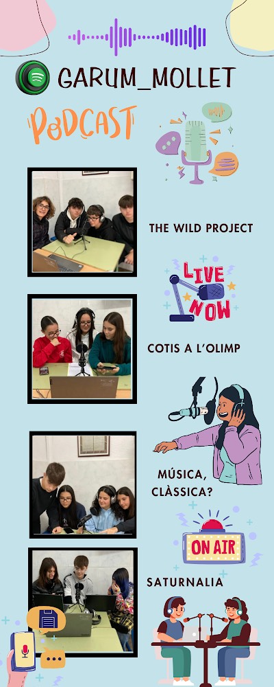 Aquest trimestre l’alumnat de 4t ha obert el seu primer pòdcast, Garum_Mollet, així com un compte d’Instagram on podreu anar veient el que treballen a classe. Hi trobareu temes diversos relacionats amb l’antiga Roma i sobretot, podreu aprendre i gaudir de l’espectacle que ofereixen aquests locutors i locutores apassionats de la cultura romana.