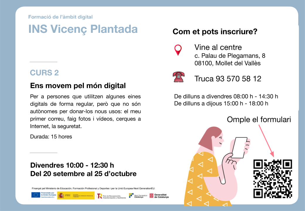 El nostre centre forma part d’aquesta xarxa, i durant aquest primer trimestre oferim el curs de nivell 2, “Ens movem pel món digital”, adreçat a persones que utilitzen algunes eines digitals de forma regular, però no són autònomes per donar-los nous usos. La durada del curs és de 15 hores.