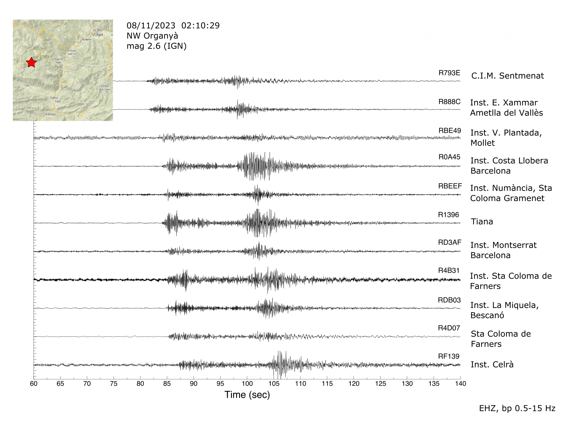 Com a exemple, podeu veure aquests registres de la xarxa de terratrèmols del 8/11/23 amb epicentre prop d’Organyà: