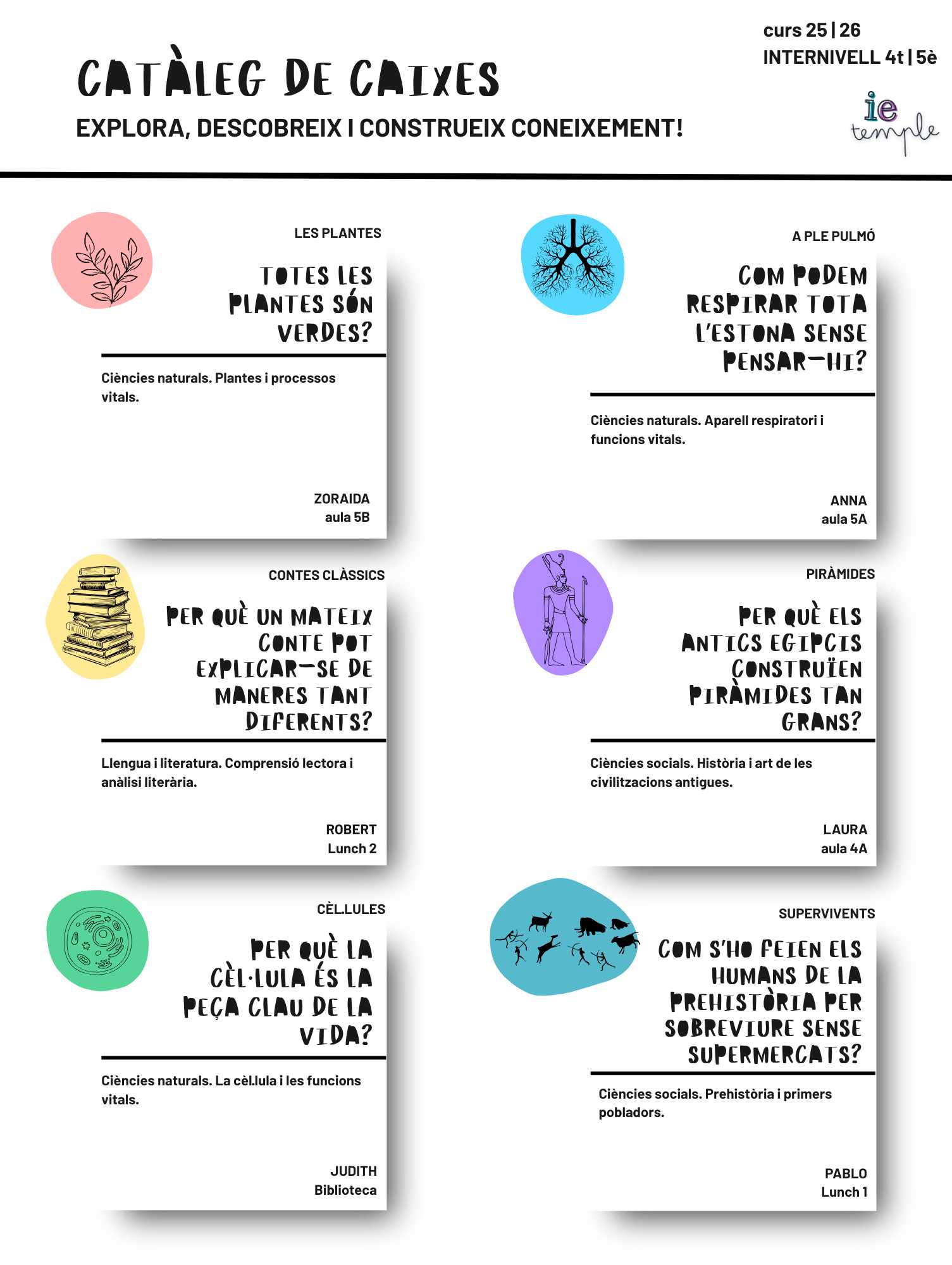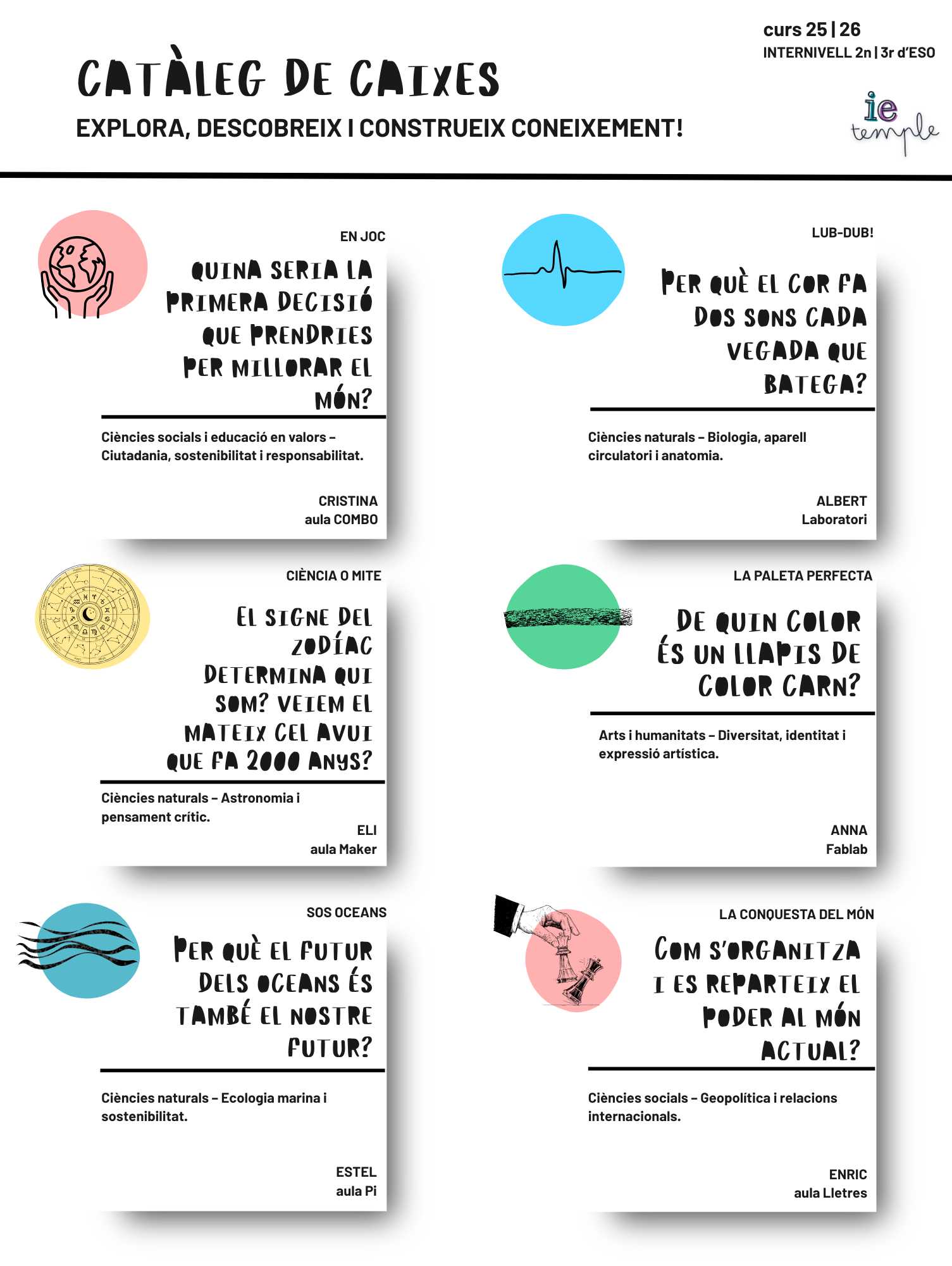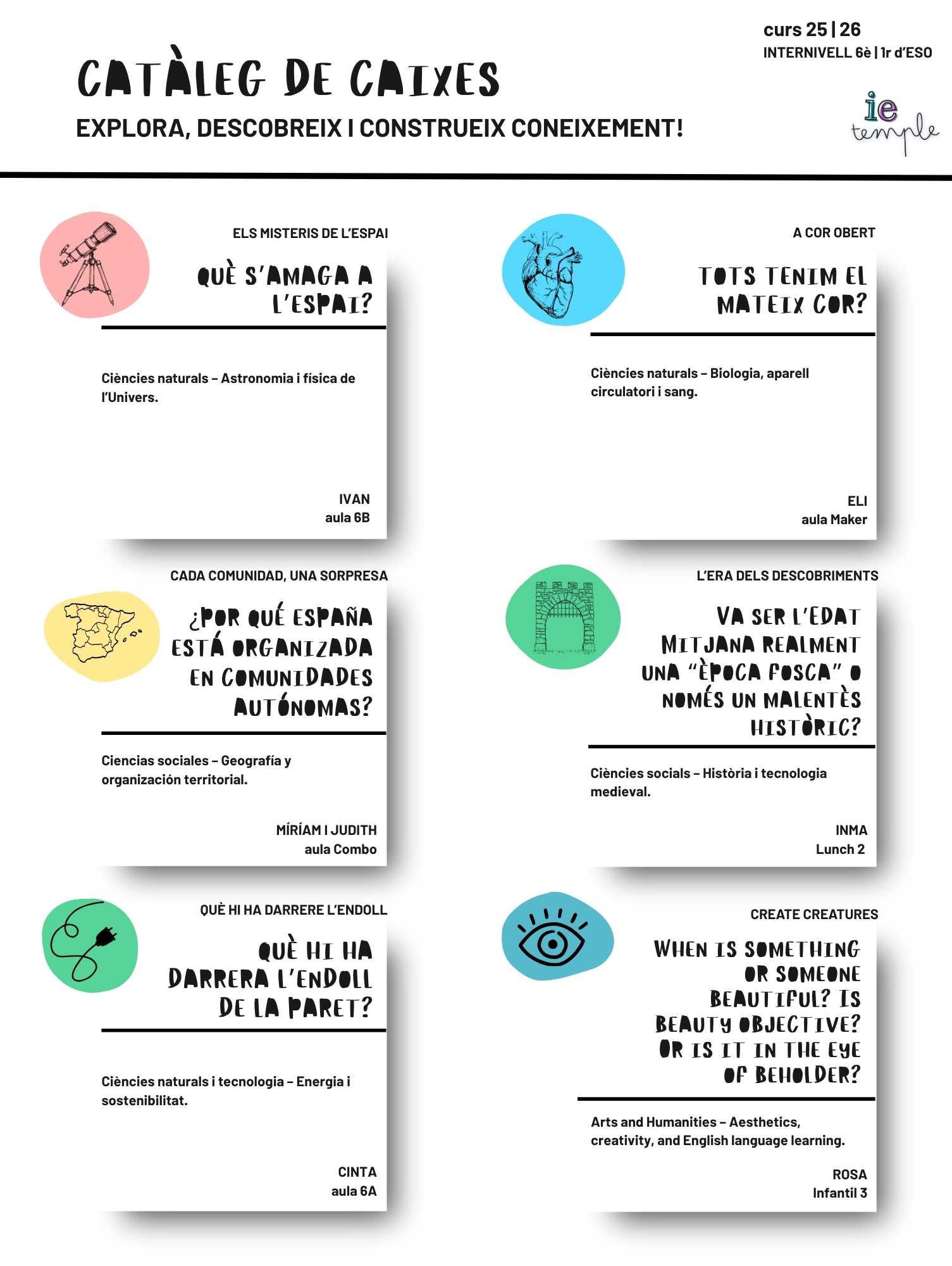 Tot seguit us presentem el catàleg de caixes d’aprenentatge compartit entre 6è i 1r d’ESO, una proposta pensada per facilitar el pas entre primària i secundària i donar continuïtat al projecte educatiu de l’Institut Escola El Temple.