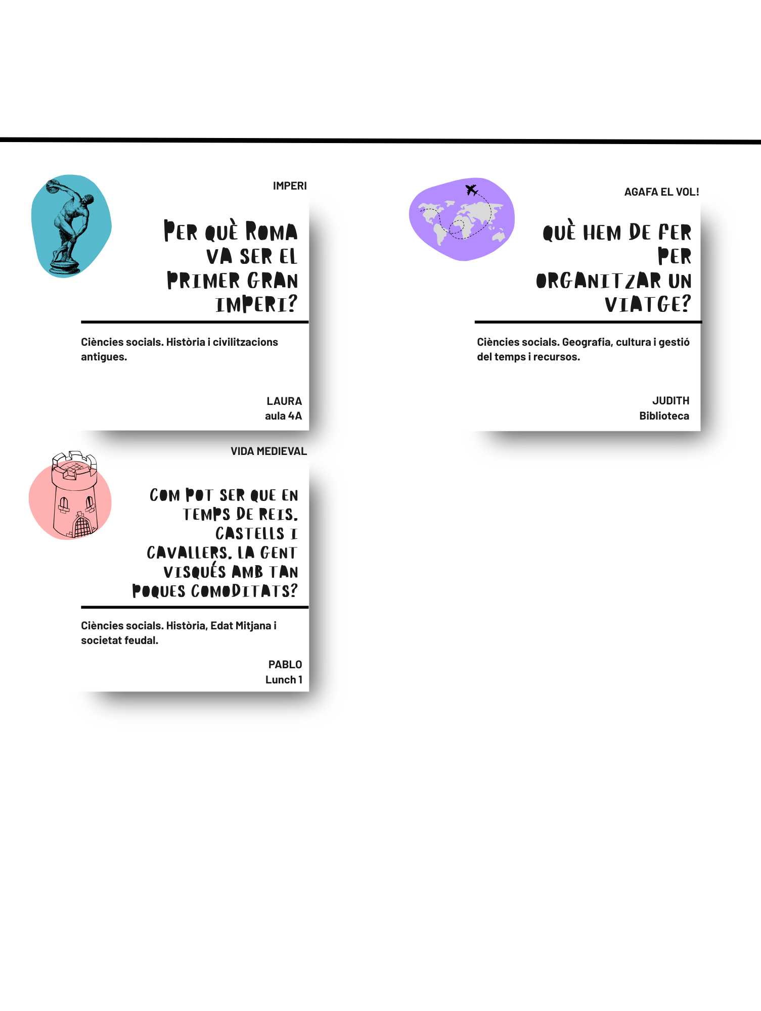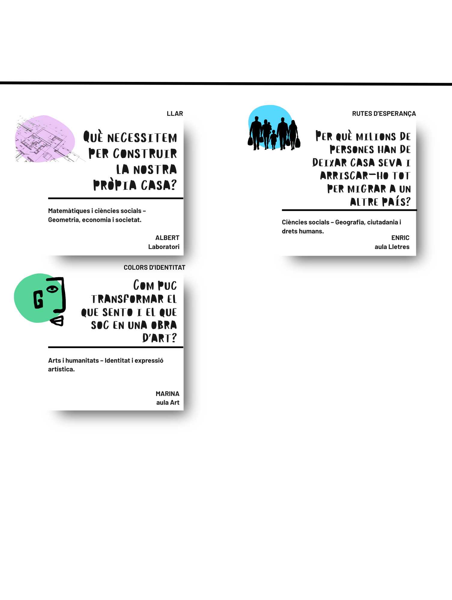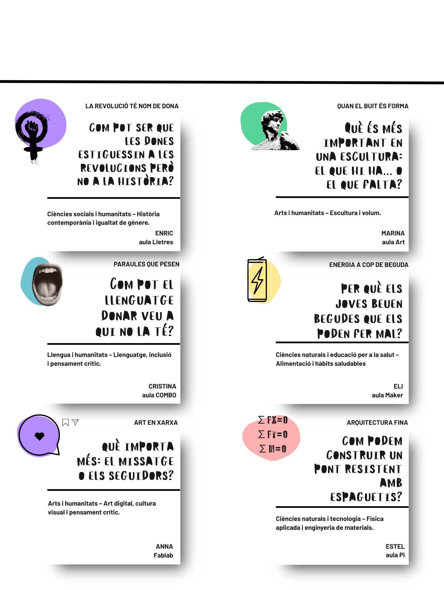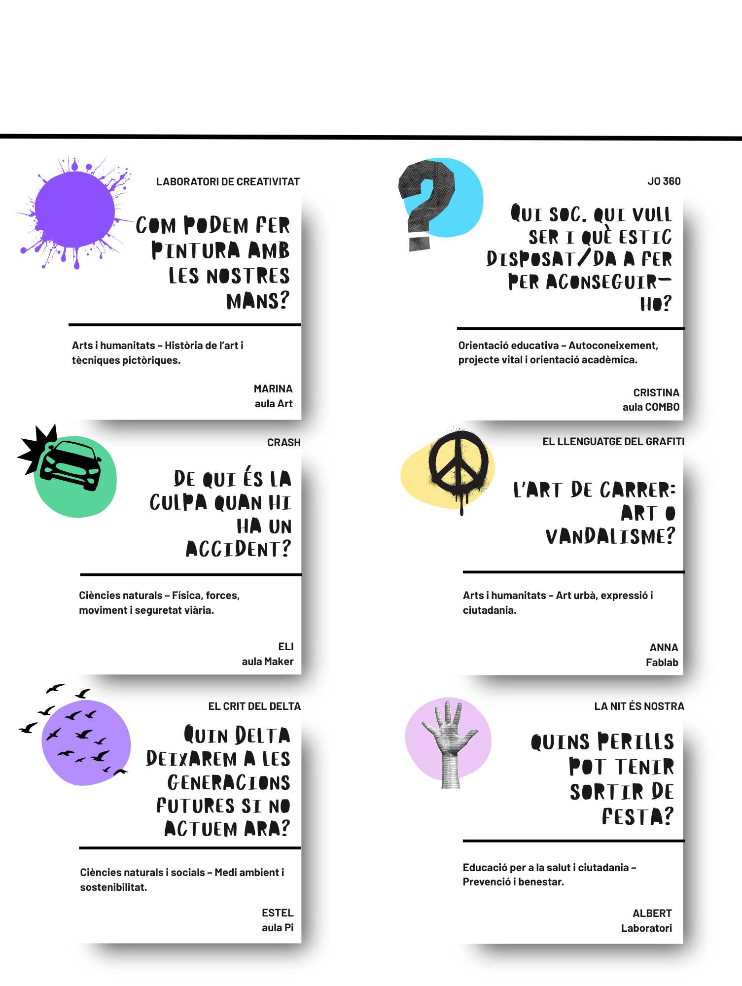 Les propostes d’aquest catàleg estan pensades per estimular el pensament crític, la creativitat i la capacitat d’anàlisi, amb reptes que impliquen recerca, debat i producció de resultats reals. L’objectiu és consolidar un perfil d’alumne actiu, reflexiu i competent, capaç de treballar de manera cooperativa i de transferir els aprenentatges a contextos diversos.