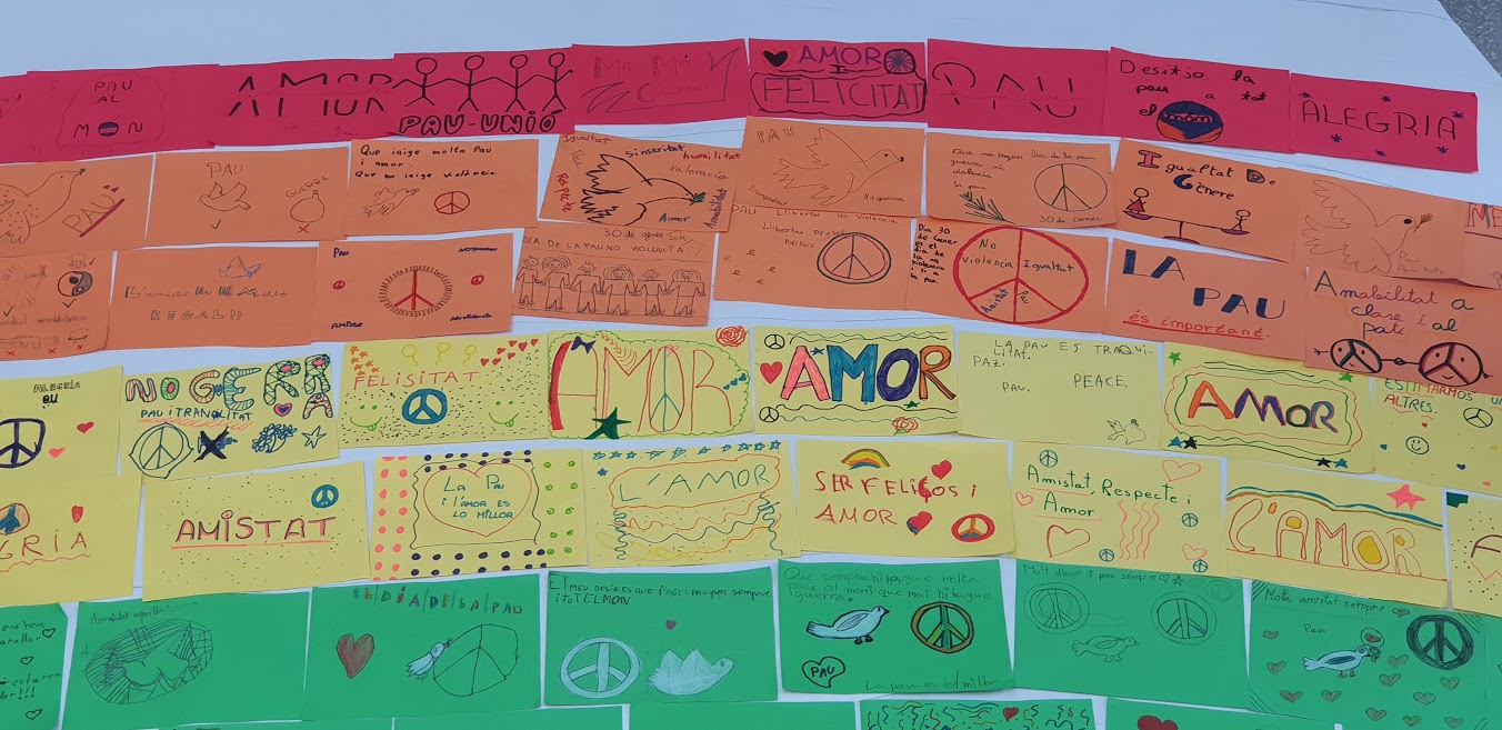 Per tant, un any més a les nostres aules s’han portat a terme diferents activitats per tal de seguir fomentant aquests valors tan necessaris per a la vida en societat. A més a més, tots els alumnes de l’escola, al llarg del matí,han construït un arc de Sant Martí gegant amb papers de colors. Cada xiquet/a ha escrit el seu missatge per expressar desitjos i bons sentiments que recordin al món la importància de la Pau.