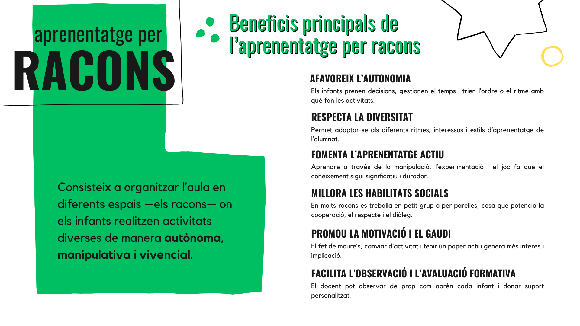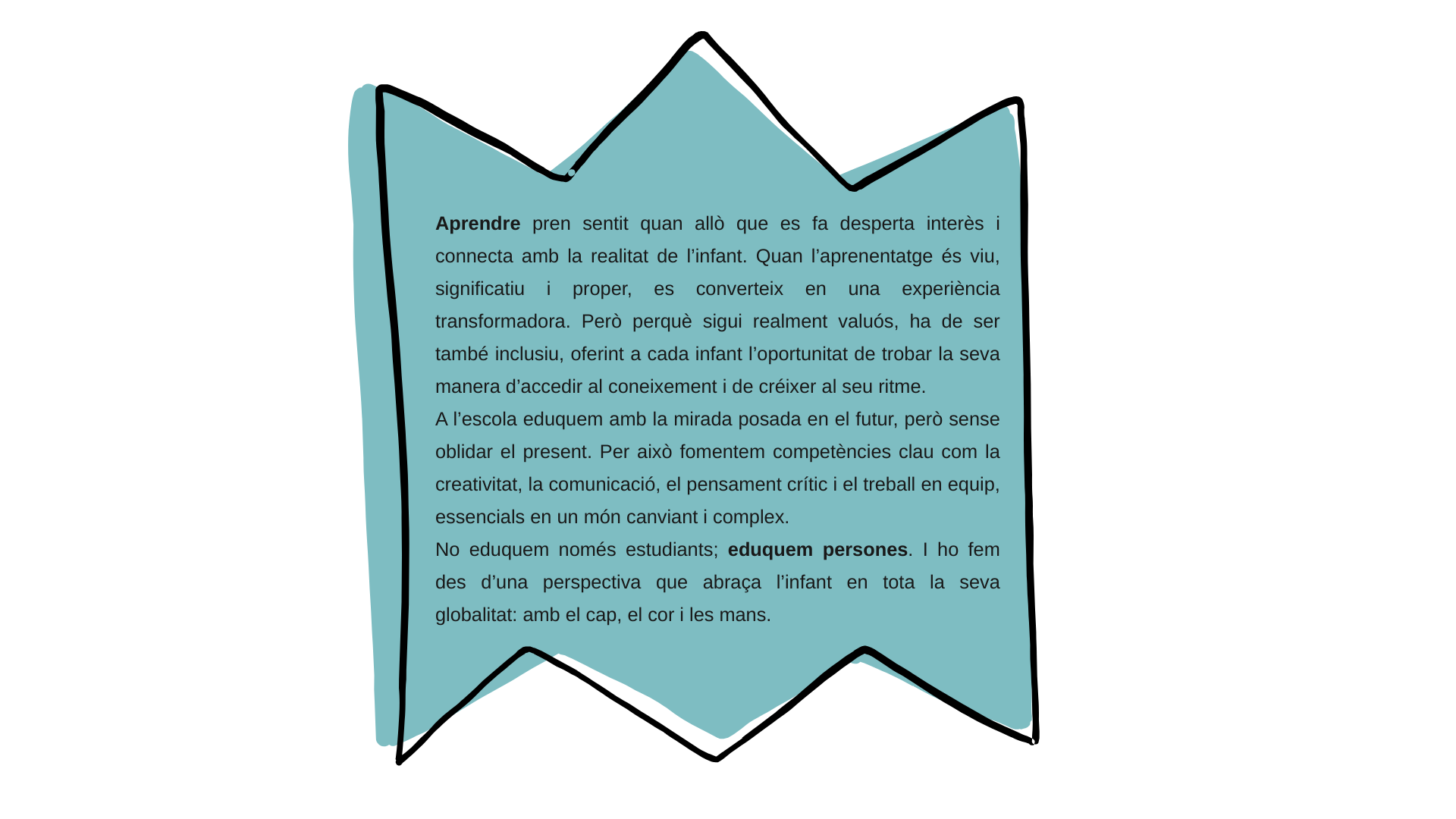 A diferència d’una visió més transmissiva, on el mestre “ensenya” i l’alumne “rep”, aquí l’infant és protagonista del seu aprenentatge i el mestre esdevé acompanyant i guia del procés.