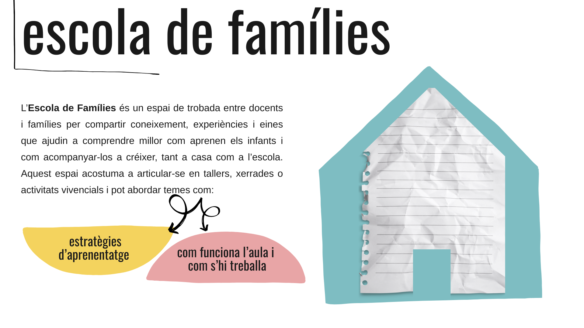 A l’escola creiem que l’educació és una tasca compartida. Per això, des del curs passat, hem posat en marxa l’Escola de Famílies, un espai de trobada on l’equip docent i les famílies podem compartir, aprendre i créixer plegats. L’objectiu és doble: enfortir el vincle entre família i escola, i acostar a les famílies el dia a dia a l’aula, perquè coneguin com aprenen els seus fills i filles i puguin donar-hi continuïtat a casa.