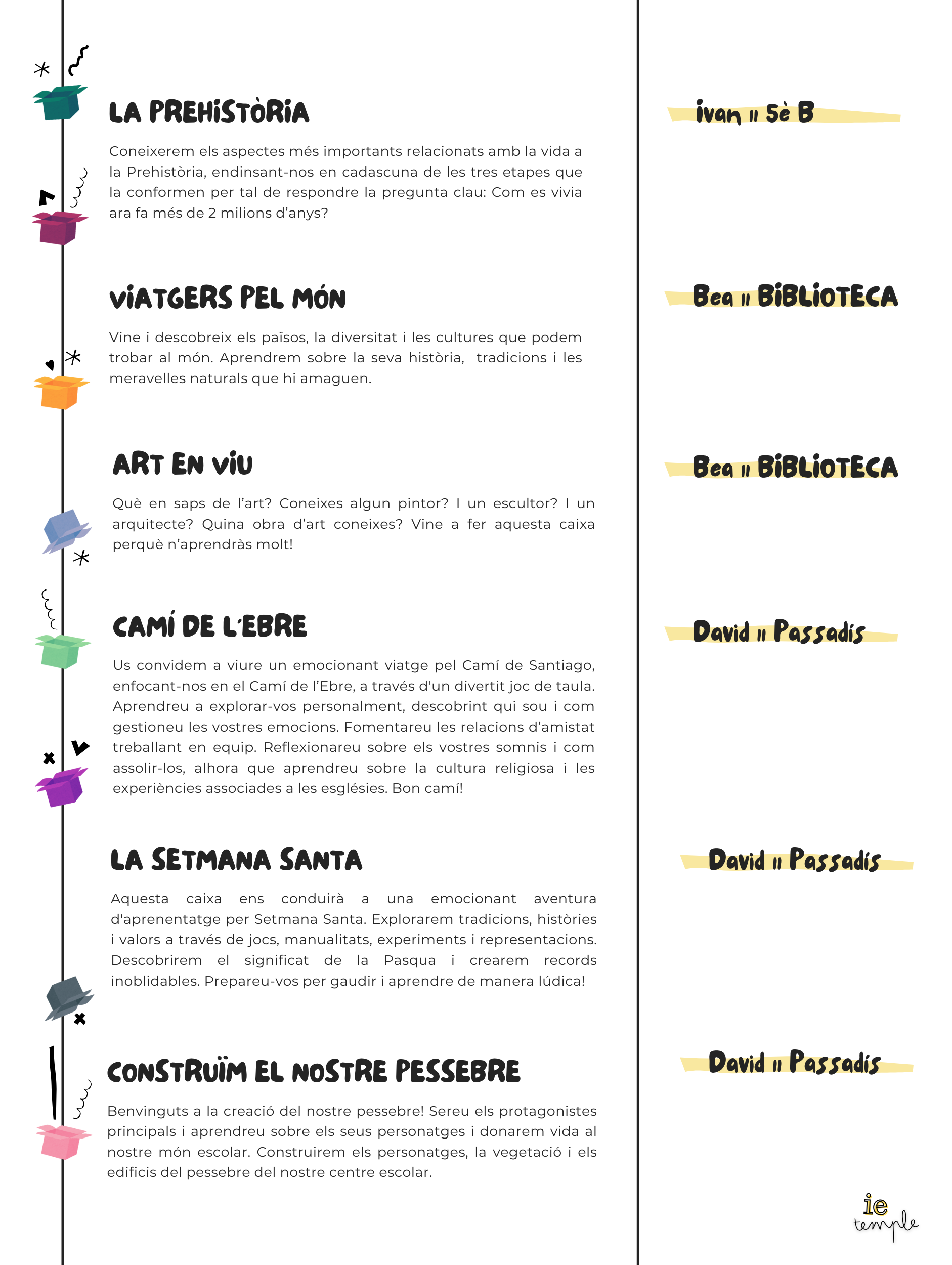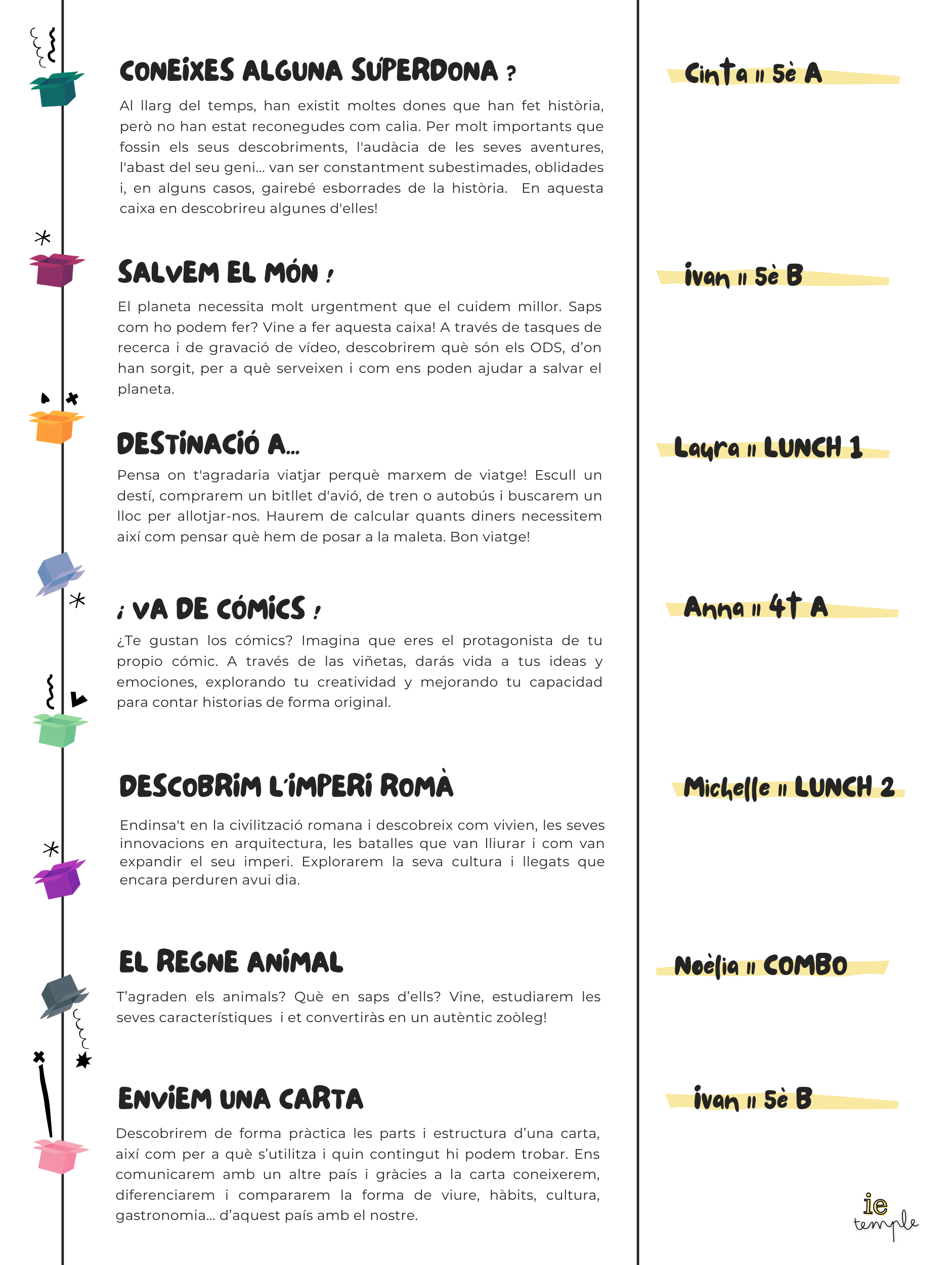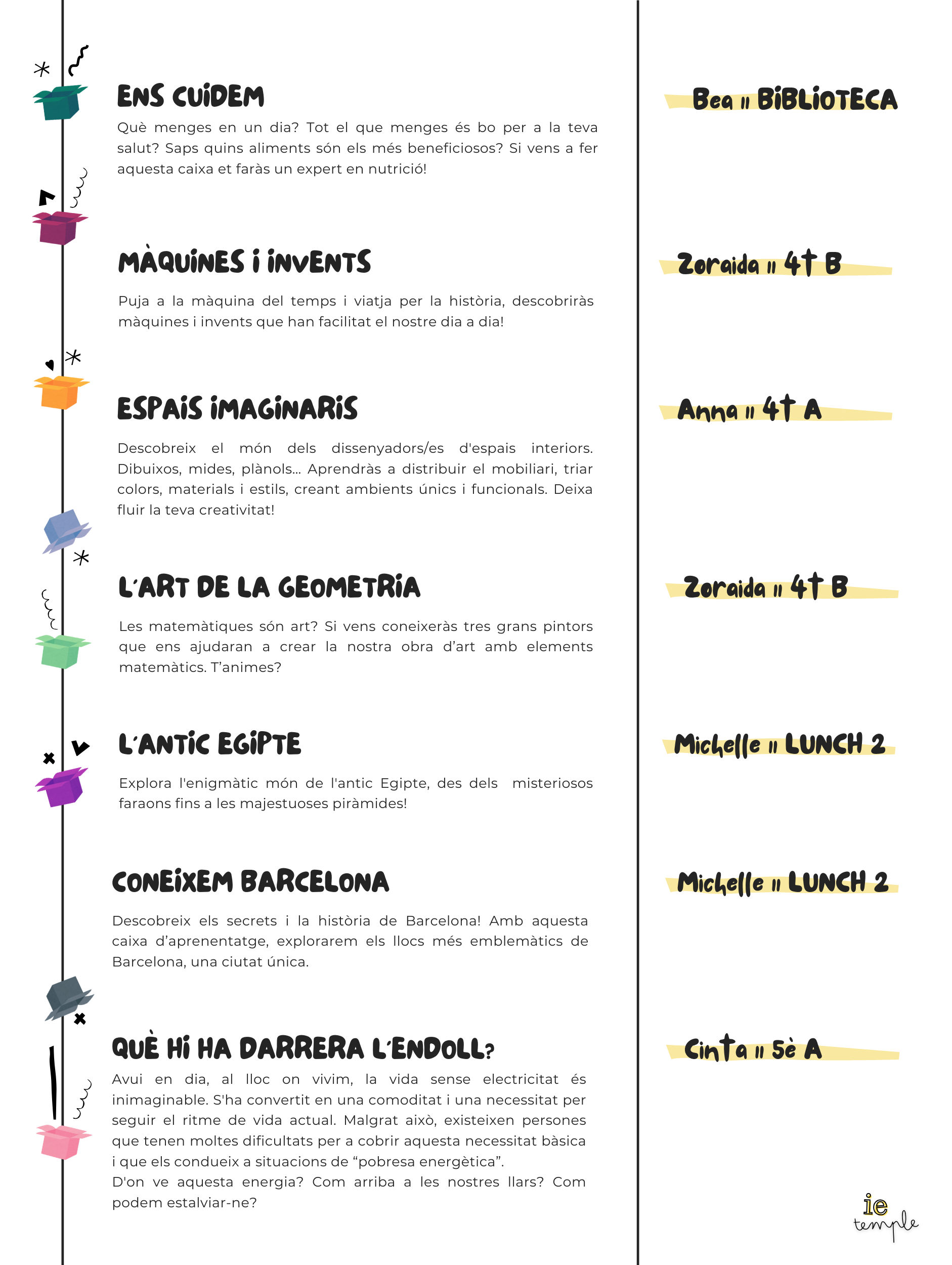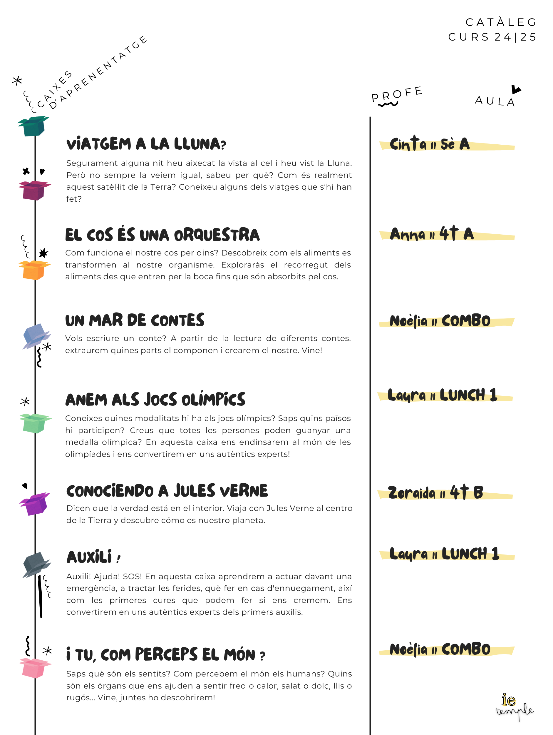 Les nostres caixes | C A T À L E G Institut Escola El Temple29/09/24 Us presentem el catàleg de caixes d’aprenentatge dels nostres infants de 4t i 5è de primària.