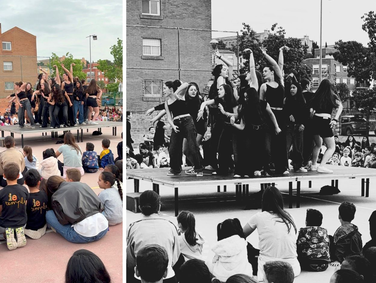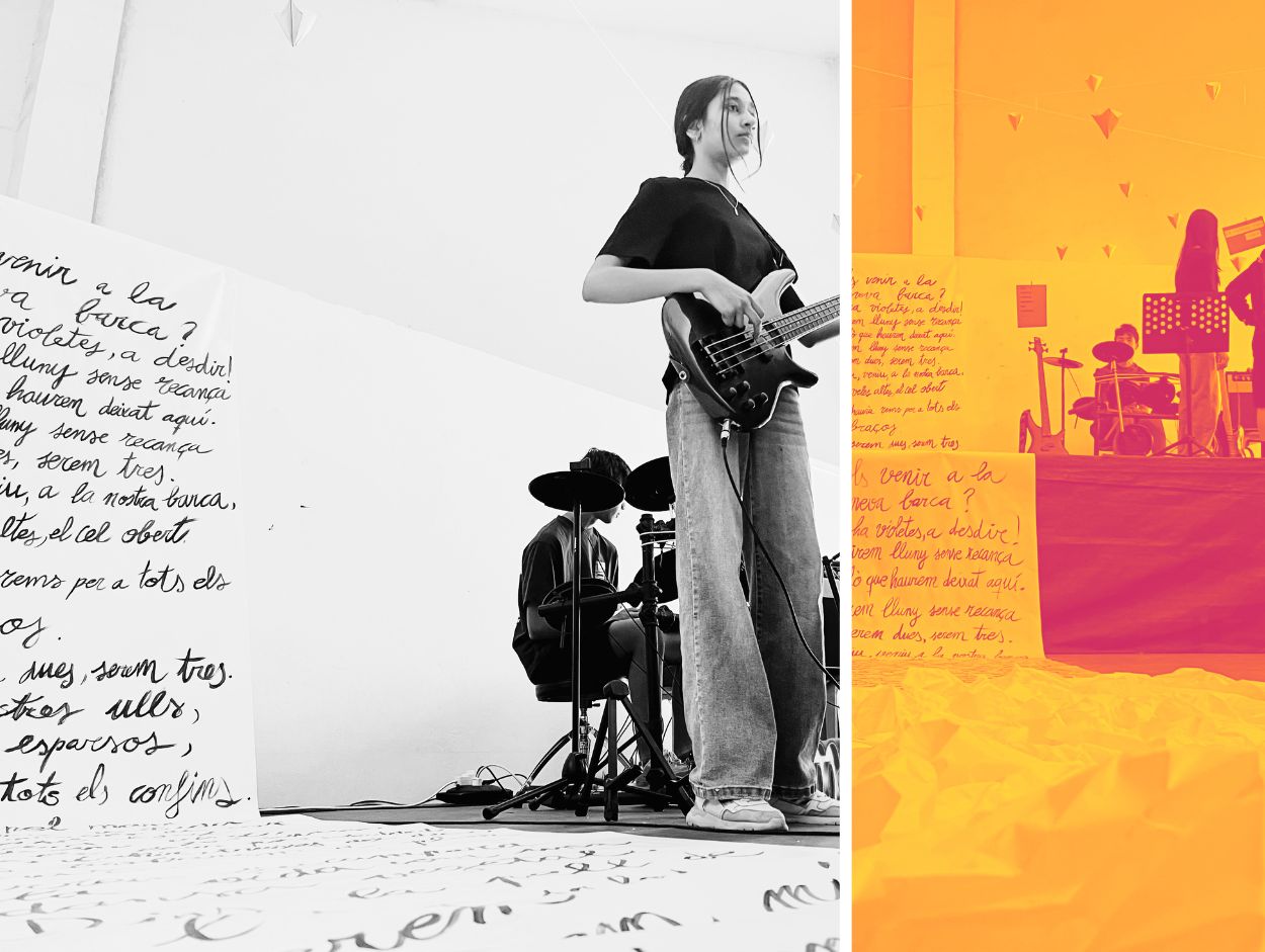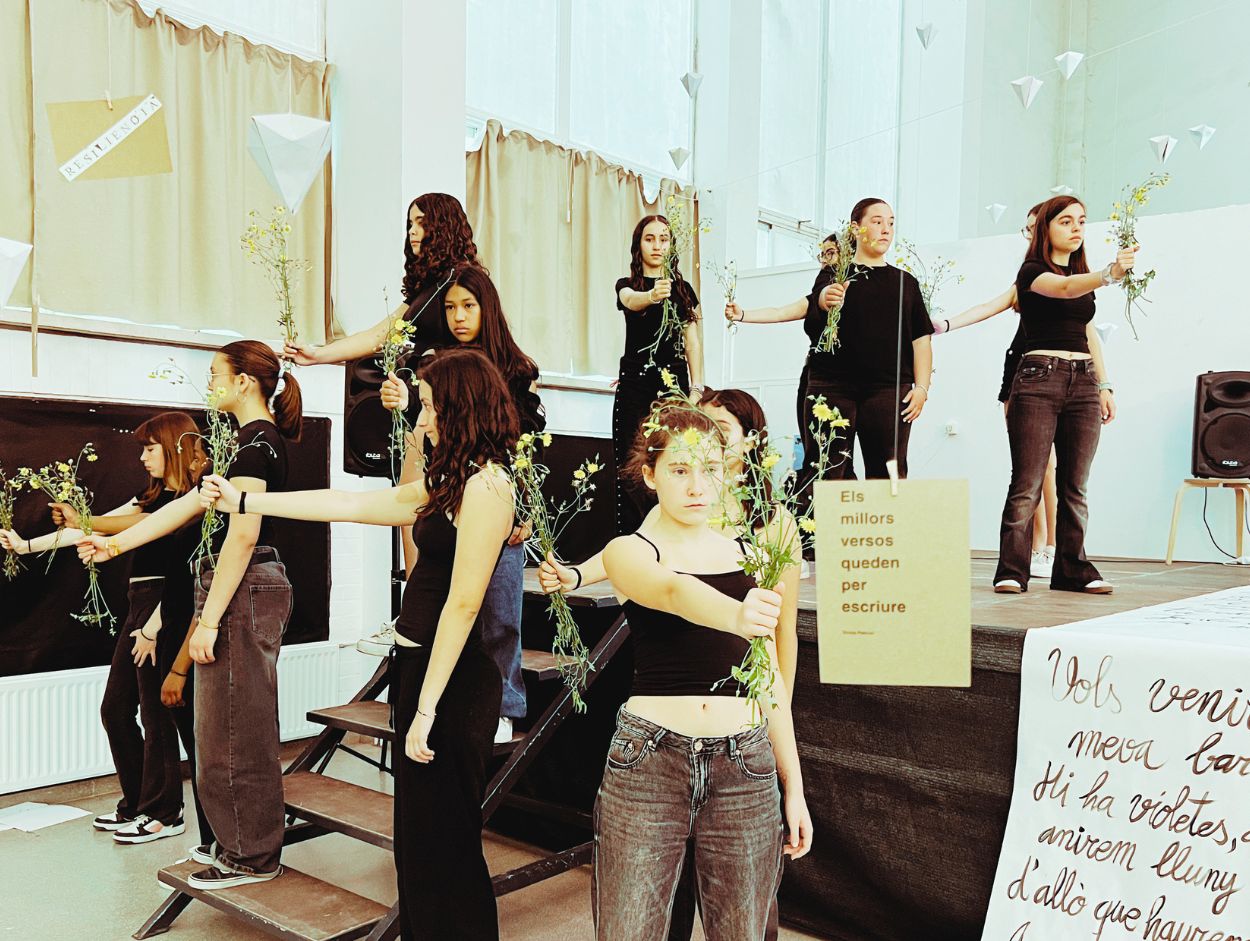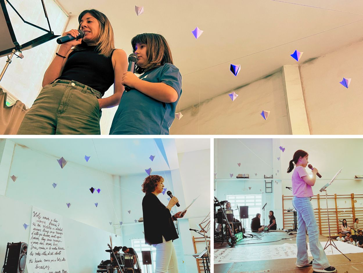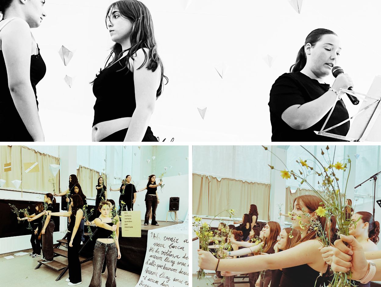 A partir d’aquest moment, el SUM es va transformar en un espai escènic que integrava literatura, música i dansa en una mateixa acció col·lectiva . Combo Musical, les alumnes d’Arts Escèniques i una representació de docents i alumnes de les comunitat de mitjans, grans i joves van construir un recital compartit. Paraules recitades, cançons en català, cossos en moviment.