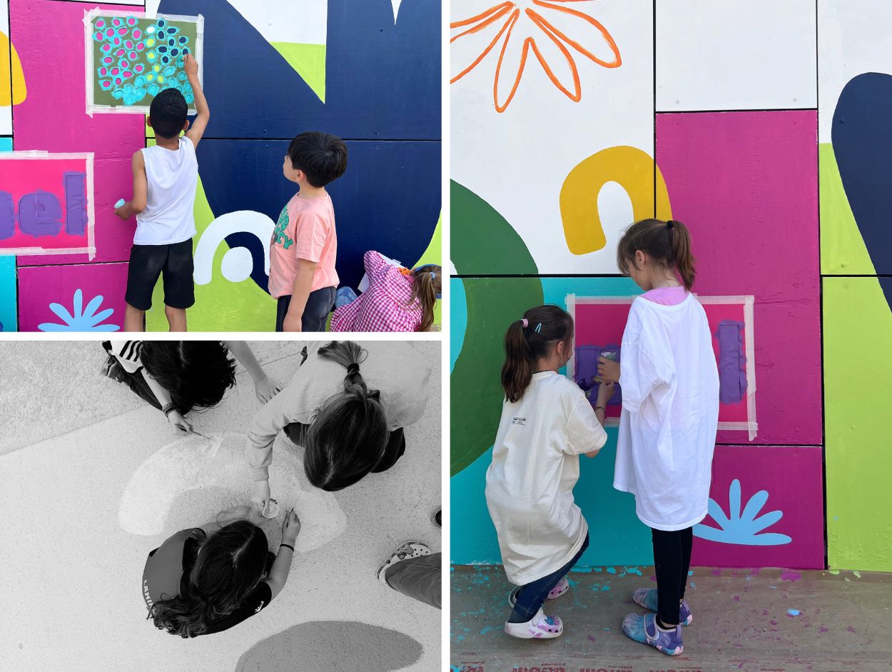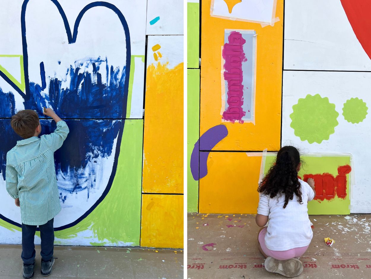De l’altra, un mural de color, paraula i capes. Paraules en català escollides pels nostres infants, superposades, entrellaçades, construïdes per moltes mans diferents. Un mural viu, que parla de comunitat: del que podem fer quan tots hi posem el nostre gest.