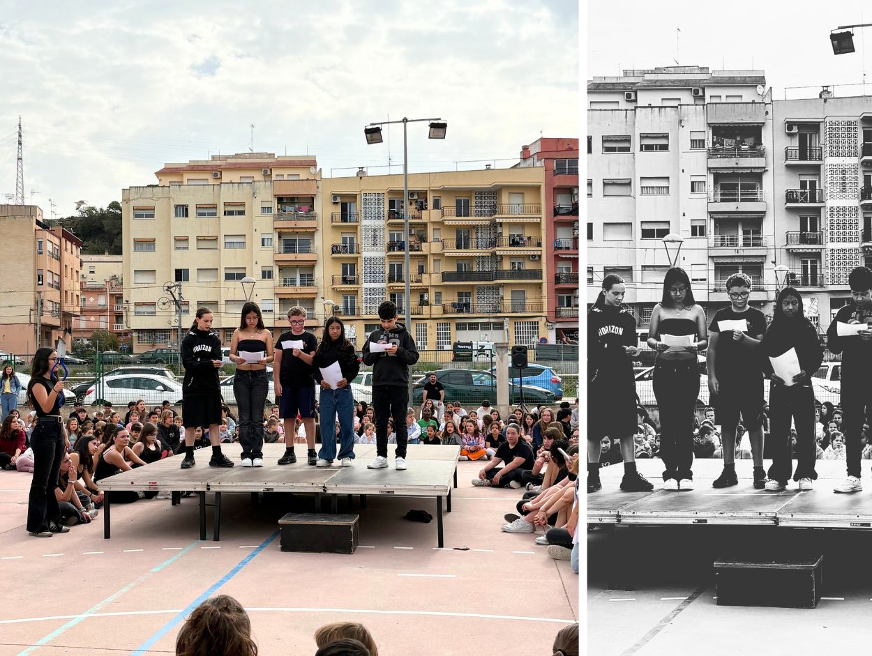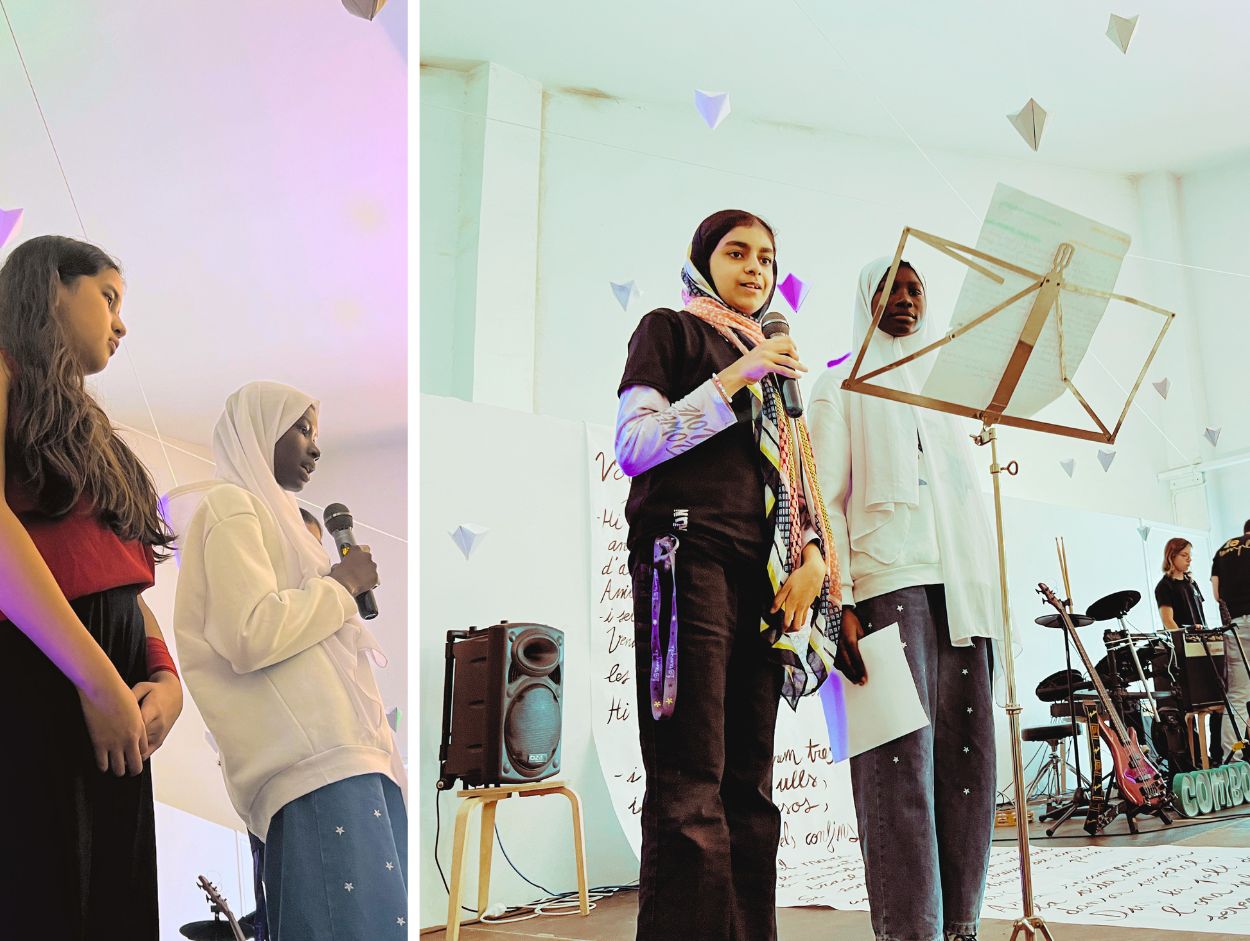 Les alumnes de teatre posaven veu i gest a la literatura. La música sostenia i amplificava les emocions. I, enmig de tot plegat, les veus de l’aula d’acollida aportaven una dimensió imprescindible: la llengua com a espai d’arribada, com a eina per entendre’ns, com a punt de trobada.