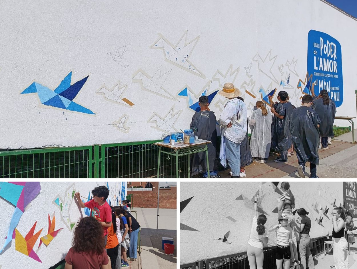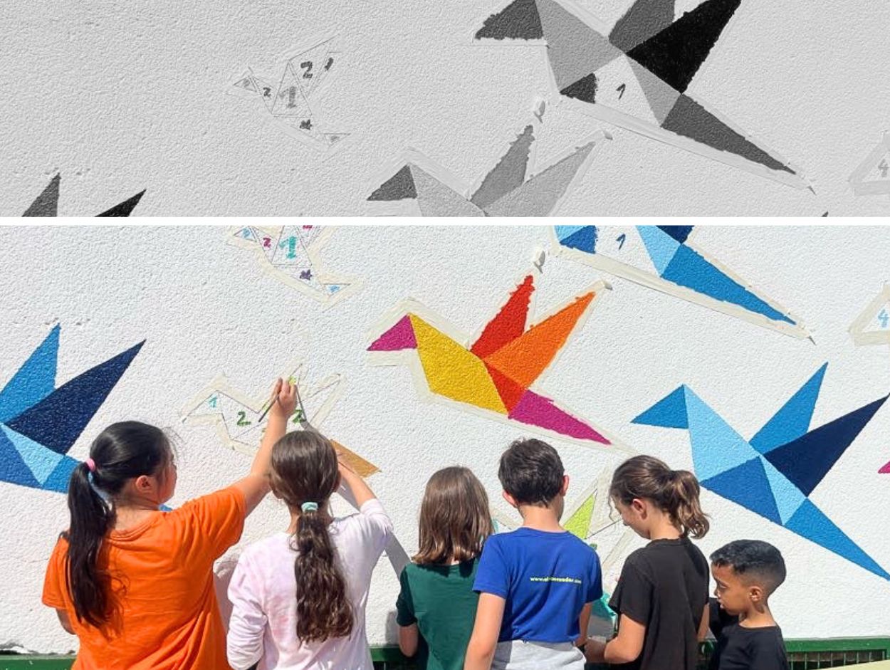 La llengua també va sortir fora de les aules i es va fer visible als murs del pati. D’una banda, un mural de muixonets de papiroflèxia. Fets de paper —com els llibres—, aquests ocells simbolitzen allò que ens passa quan llegim: el pensament s’eleva, la imaginació vola, la mirada s’eixampla.