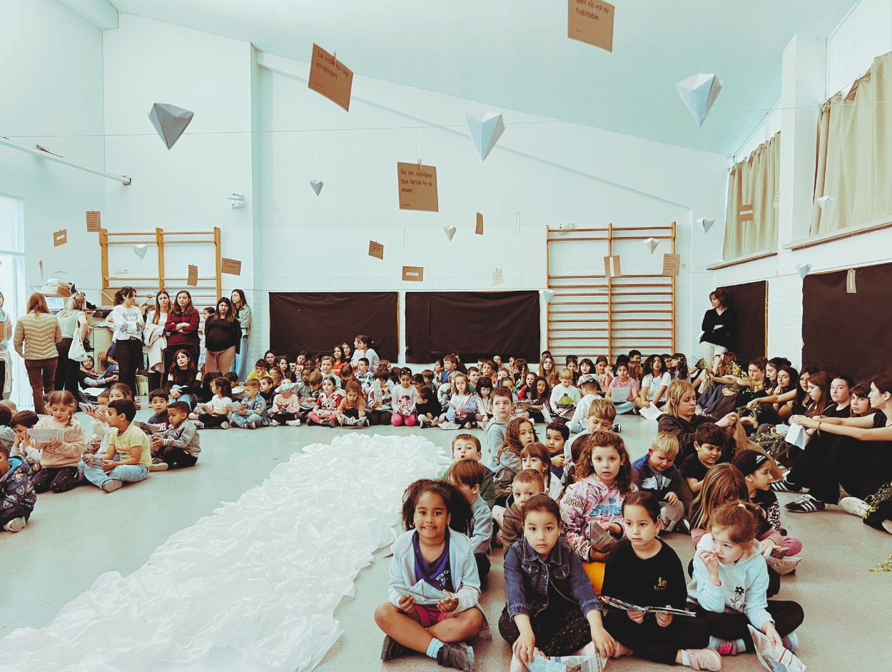 Els diamants de paper, elaborats per la comunitat de grans, evocaven La plaça del Diamant de Mercè Rodoreda. Un símbol que ens recorda que, fins i tot en temps difícils, les paraules ens ajuden a trobar la veu i a reconstruir-nos. Les postals literàries, creades pels joves, eren petites peces de pensament i emoció: fragments, paraules, que convidaven a aturar-se i mirar. I el riu de paraules, inspirat en Cançó de fer camí de Maria Mercè Marçal, travessava l’espai com una metàfora col·lectiva. Cada infant hi deixava la seva barqueta de paper, afirmant una idea senzilla i poderosa: el camí de la llengua el fem junts.