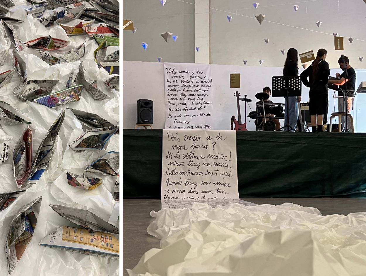 Tot l’acte estava abraçat per una instal·lació artística carregada de significat. Aquesta connexió amb la papiroflèxia no és casual. És el fil que uneix els murs del pati amb el SUM, recordant-nos que l’art pot travessar espais, formats i llenguatges.