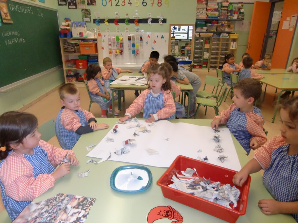 Els nens de P3 fem composicions en grup. Primer hem esquinçat paper i l’hem enganxat al mural. FOTOS Després hem