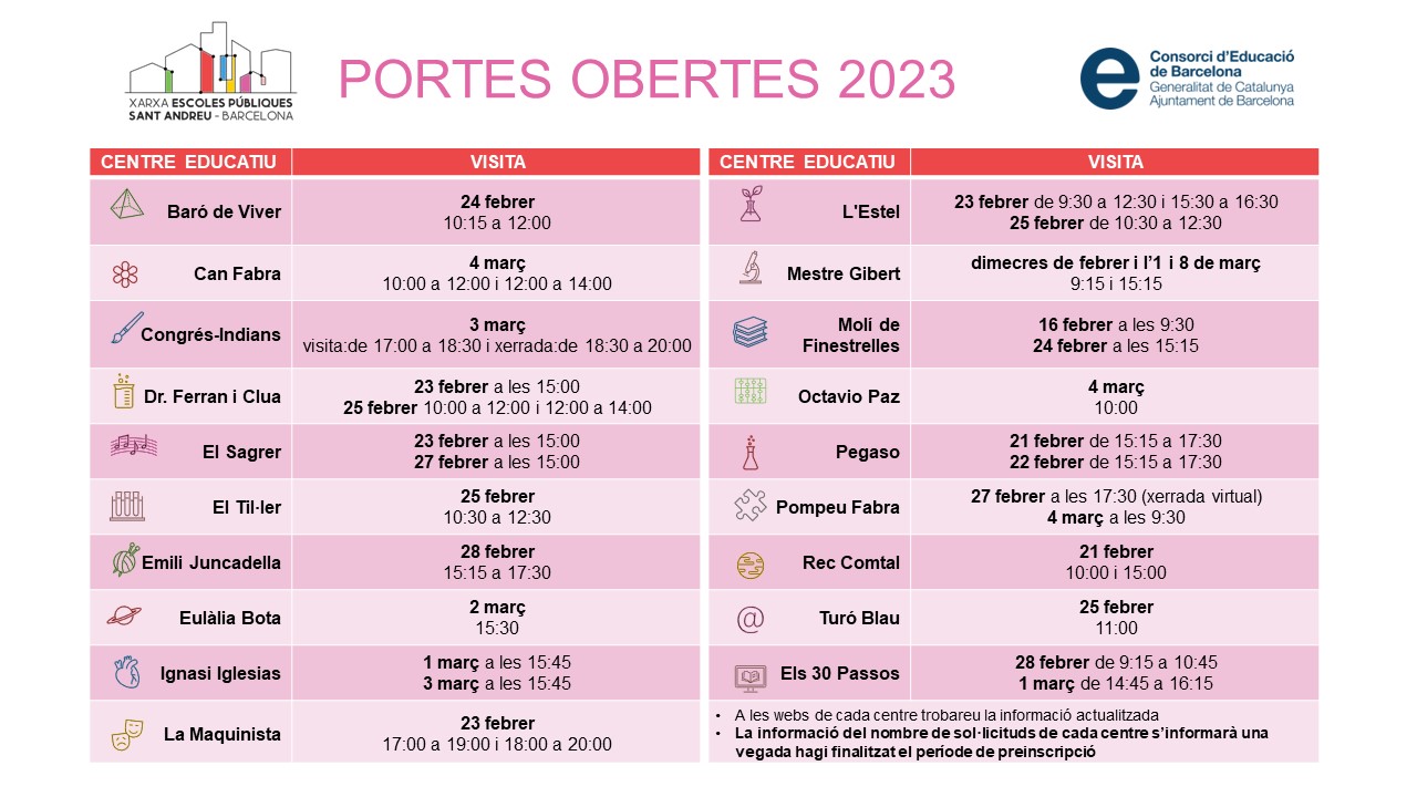 Compartim amb vosaltres el calendari de portes obertes de les escoles públiques del districte de Sant Andreu.