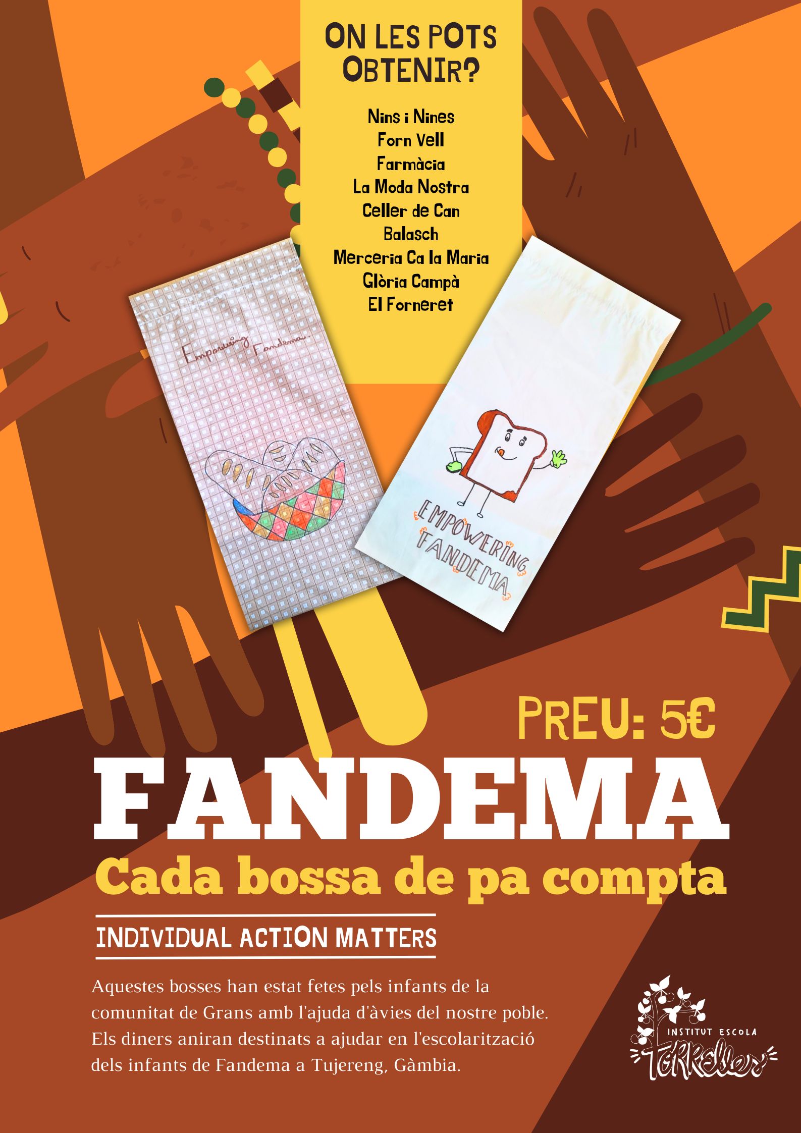 Us volem recordar que podeu trobar en alguns establiments de la vila les bosses de pa que han confeccionat l’alumnat de 4t a 6è de primària. Es tracta d’una iniciativa solidària per col·laborar amb Fandema, que vetlla per l’escolartizació de Tujereng (Gàmbia).