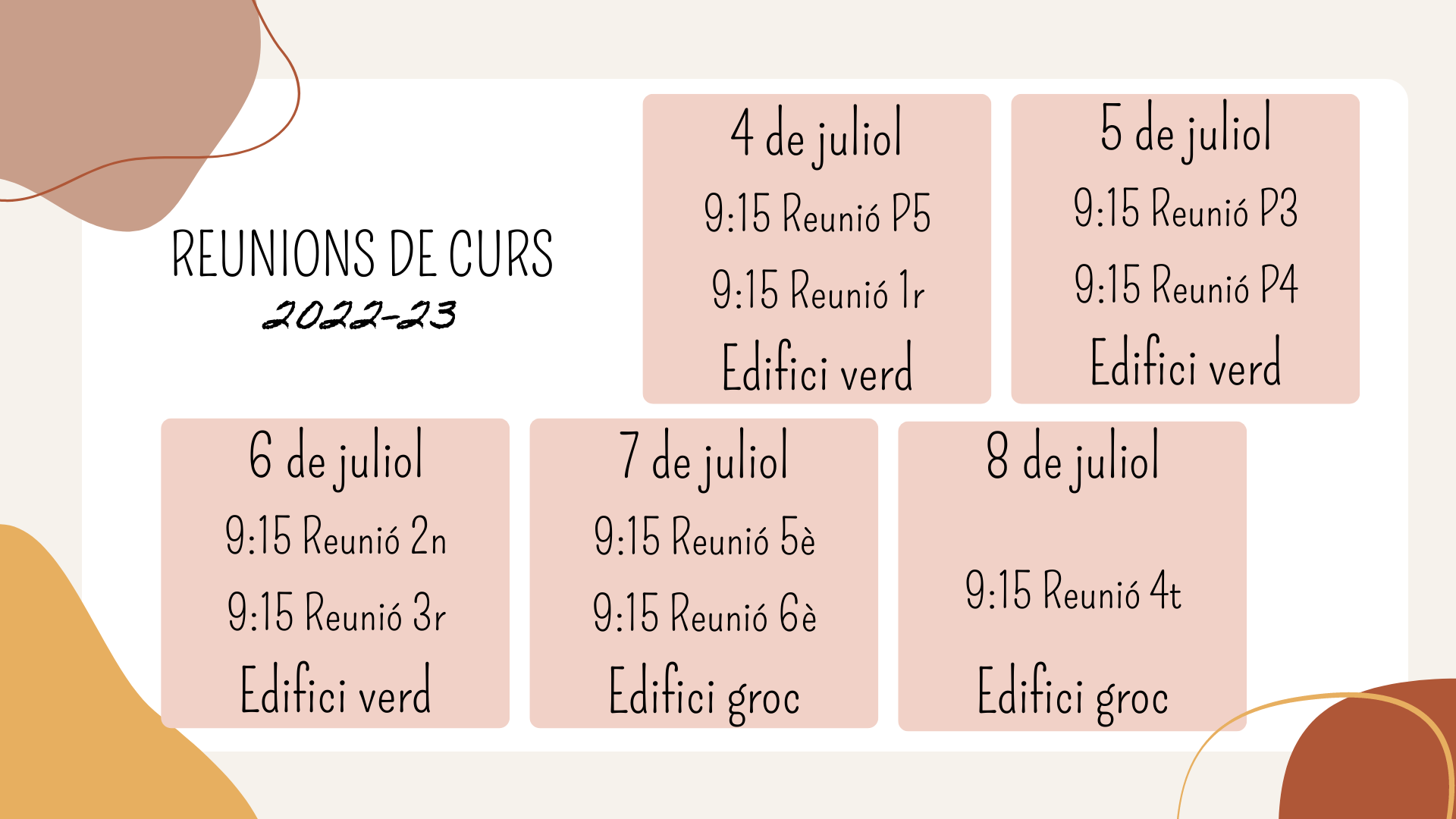 Reunions de curs a infantil i primària admin01/06/22 Avancem les reunions de principi de curs per marxar de vacances amb tota la informació necessària per engegar un bon nou curs escolar.
