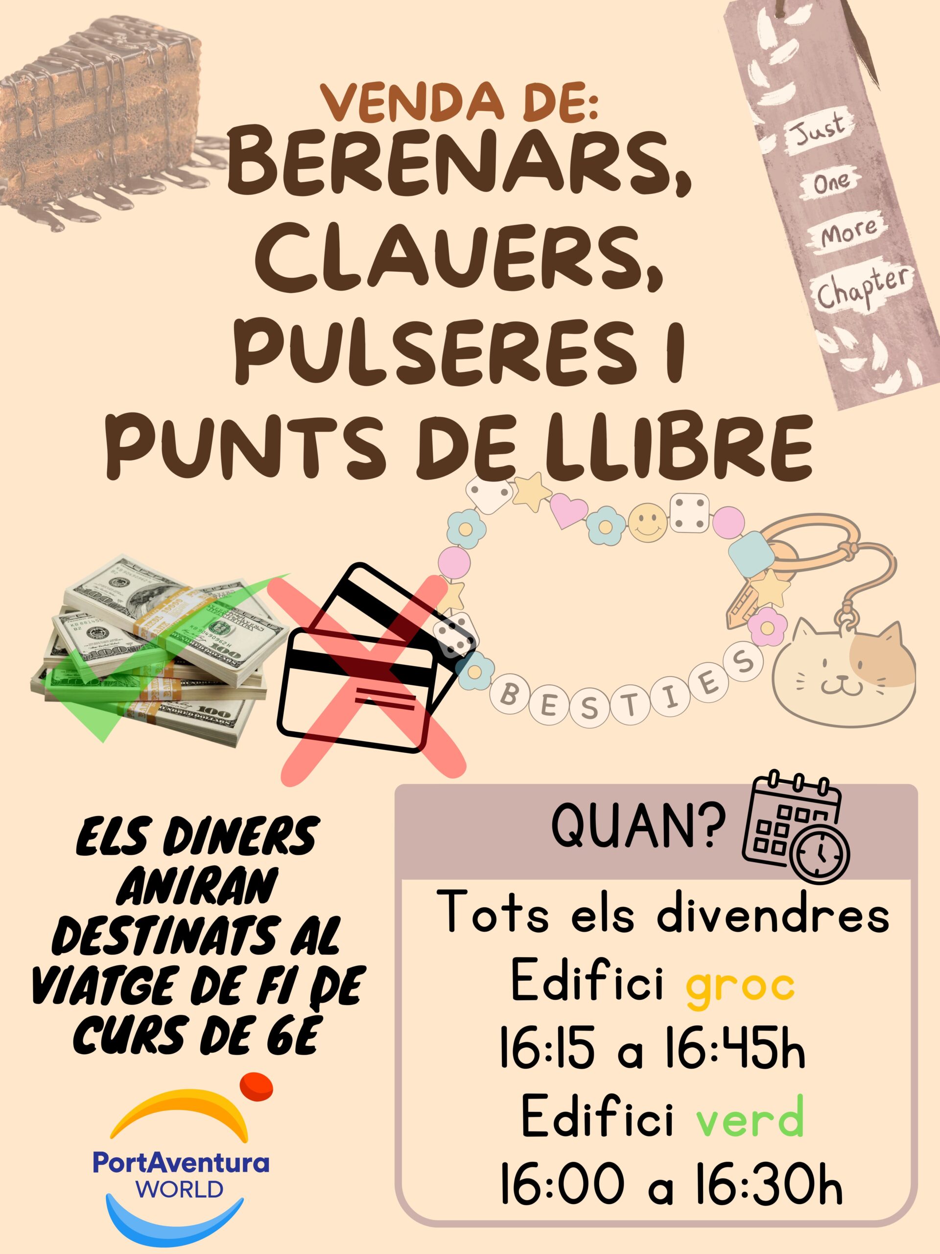 Estarem tots els divendres (a partir del divendres 3 de novembre) a la porta dels dos edificis preparant uns berenars ben dolços i salats a uns preus immillorables per a quan surti la canalla d’educació infantil i primària a la tarda!