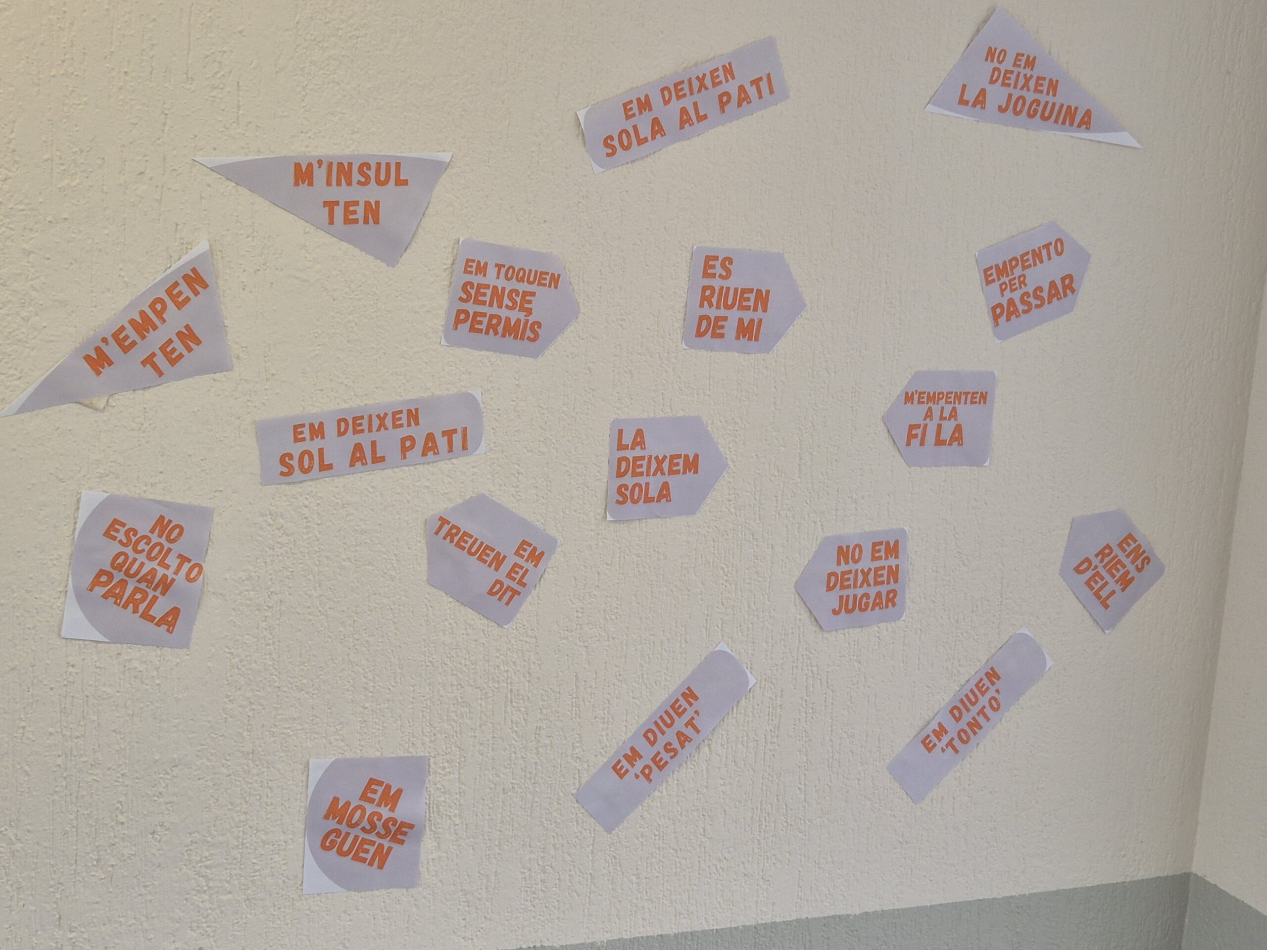 En una primera fase, vam dur a terme una recollida de dades a través de qüestionaris en línia, adreçats a l’alumnat de 5è de primària a 4t d’ESO, i mitjançant dinàmiques orals amb els infants d’I3 a 4t de primària. Les preguntes feien referència a aquelles accions que fem o rebem i que no ens fan sentir bé, així com a tot allò que sí que ens genera benestar. A les imatges podeu veure alguns exemples de les aportacions recollides.