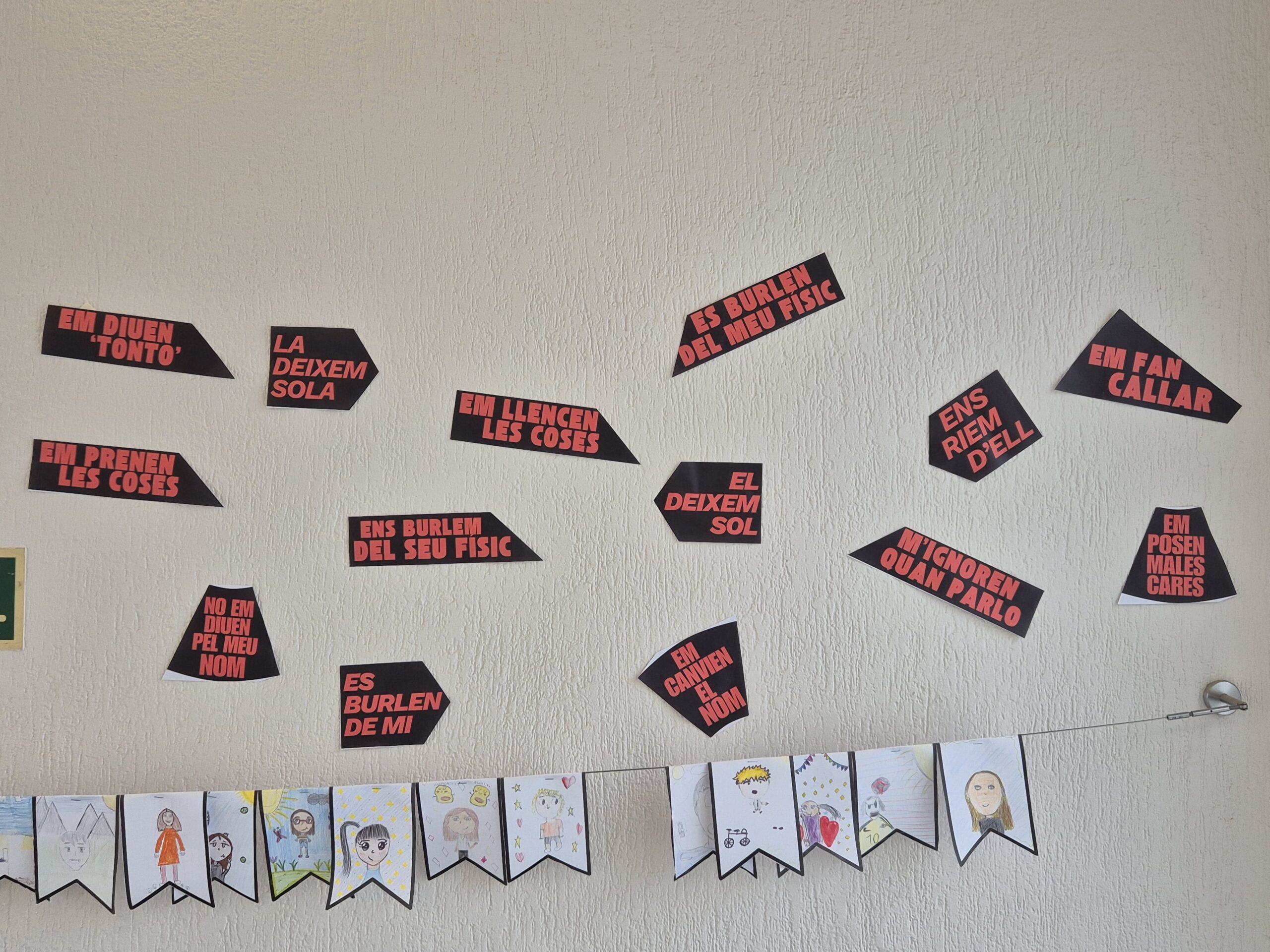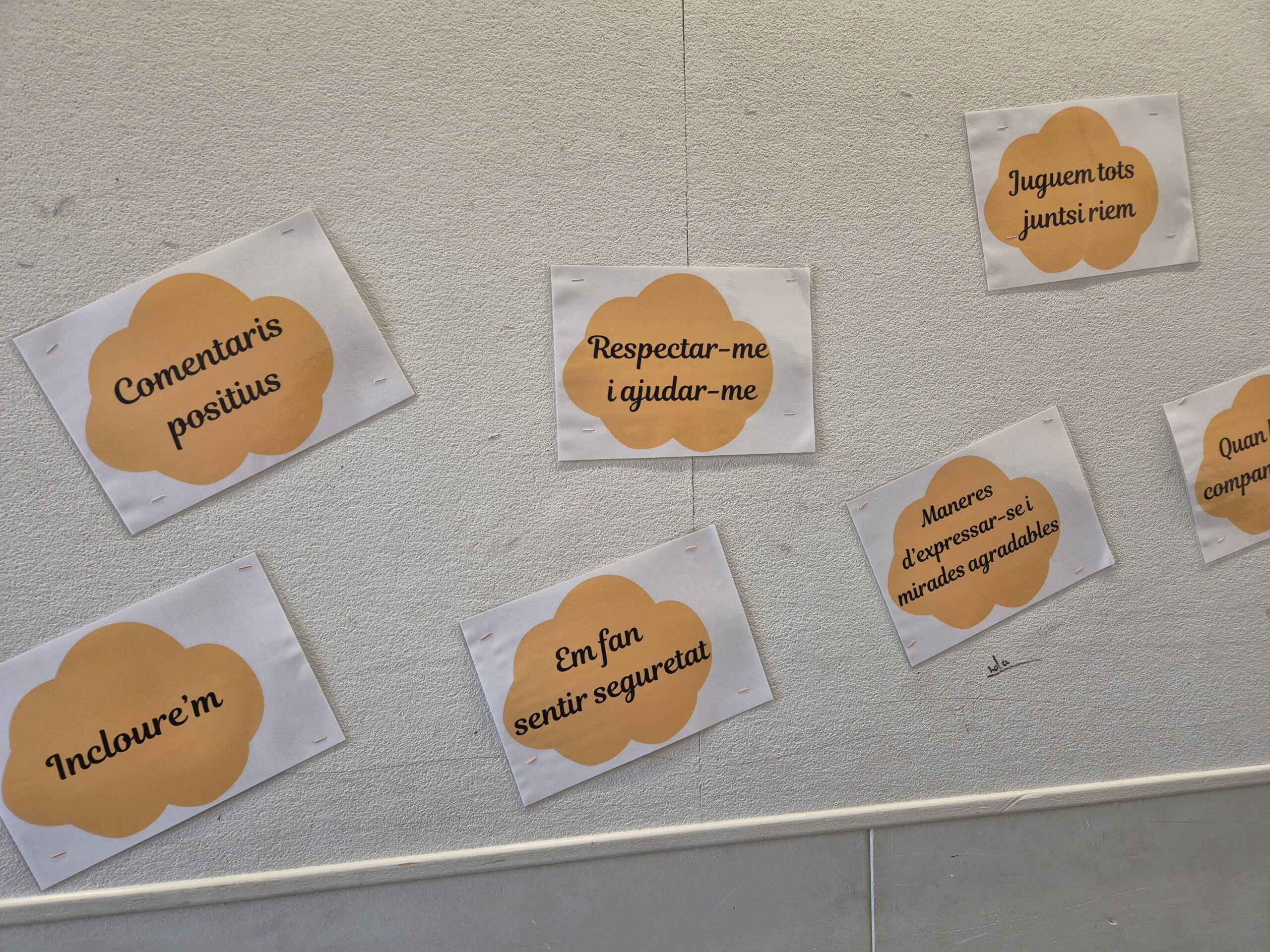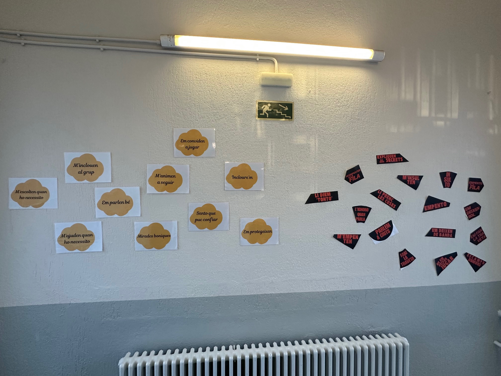 Potser us ha sorgit la pregunta de per què vam optar per recollir també els aspectes negatius i no només els positius. Des de la mirada de les pràctiques restauratives, vam considerar important prendre consciència de quines són les accions o comentaris que ens fan sentir malament per poder transformar-los, i alhora evidenciar el contrast amb aquelles accions i actituds que sí que ens agraden i volem potenciar. En aquest sentit, vam decidir plastificar els missatges positius com a símbol de tot allò que volem que perduri, mentre que els aspectes negatius representen allò que desitgem que desaparegui tan aviat com sigui possible.