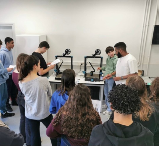 D’altra banda, una de les seves contribucions més destacades ha estat la formació de 30 alumnes de secundària com a referents makers del centre. Aquests estudiants, seleccionats per la seva motivació i interès, han après a utilitzar eines de fabricació digital com la impressió 3D, la talladora làser, programació, Arduino… Ara, són ells els qui assumeixen el rol de creadors i assessors dins l’escola, ajudant tant al professorat com als companys a dur a terme projectes que requereixen la creació de materials.