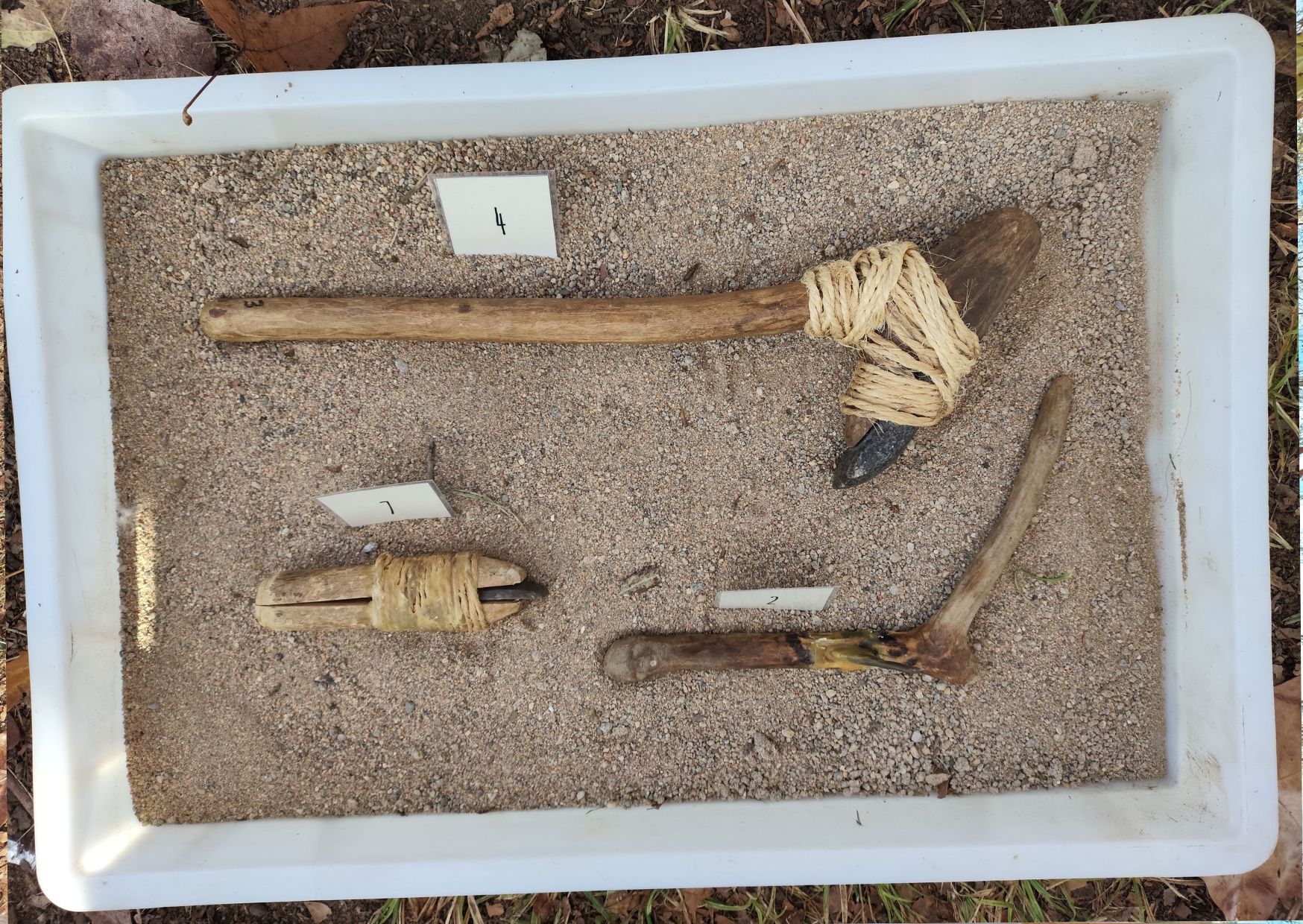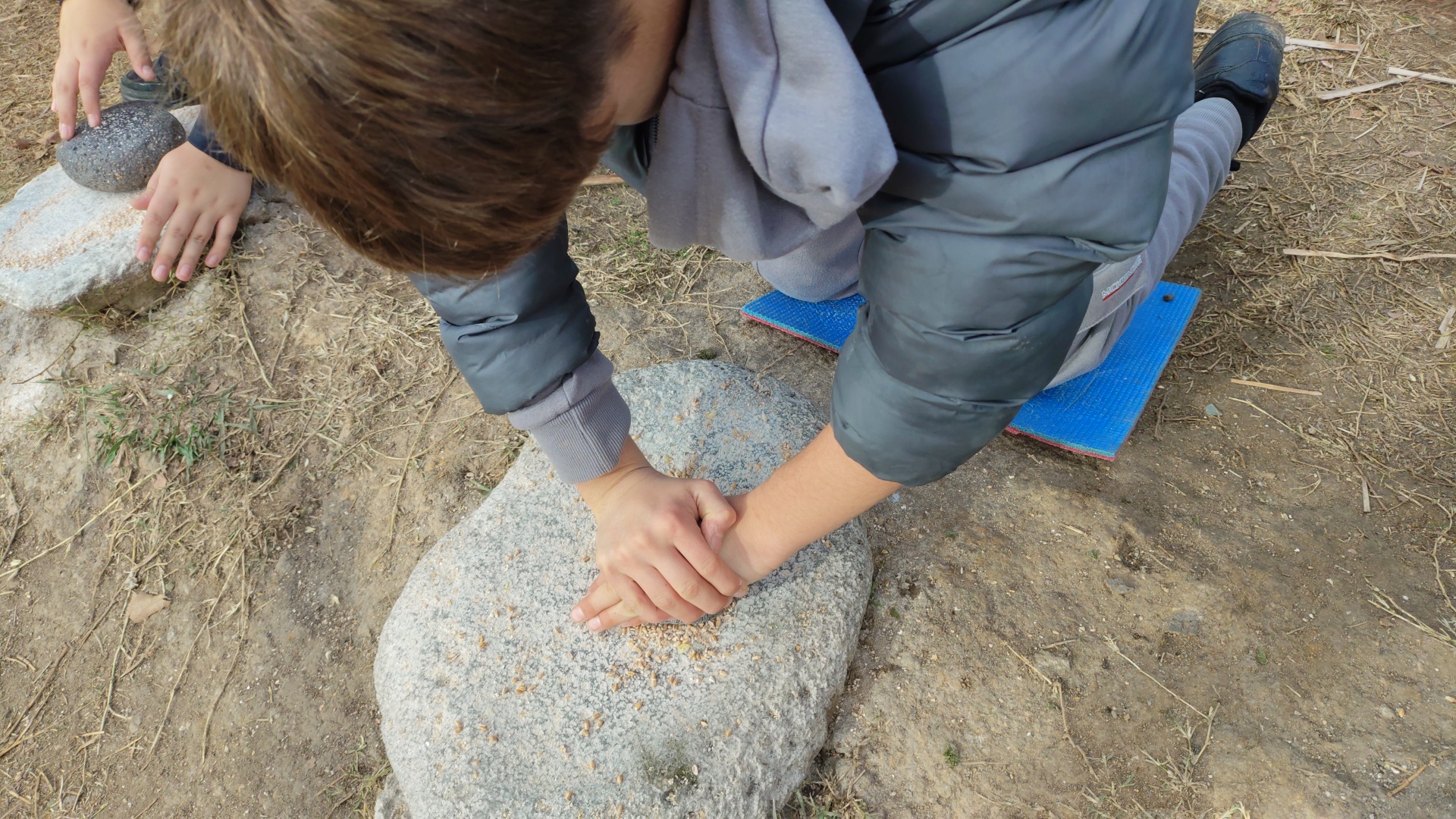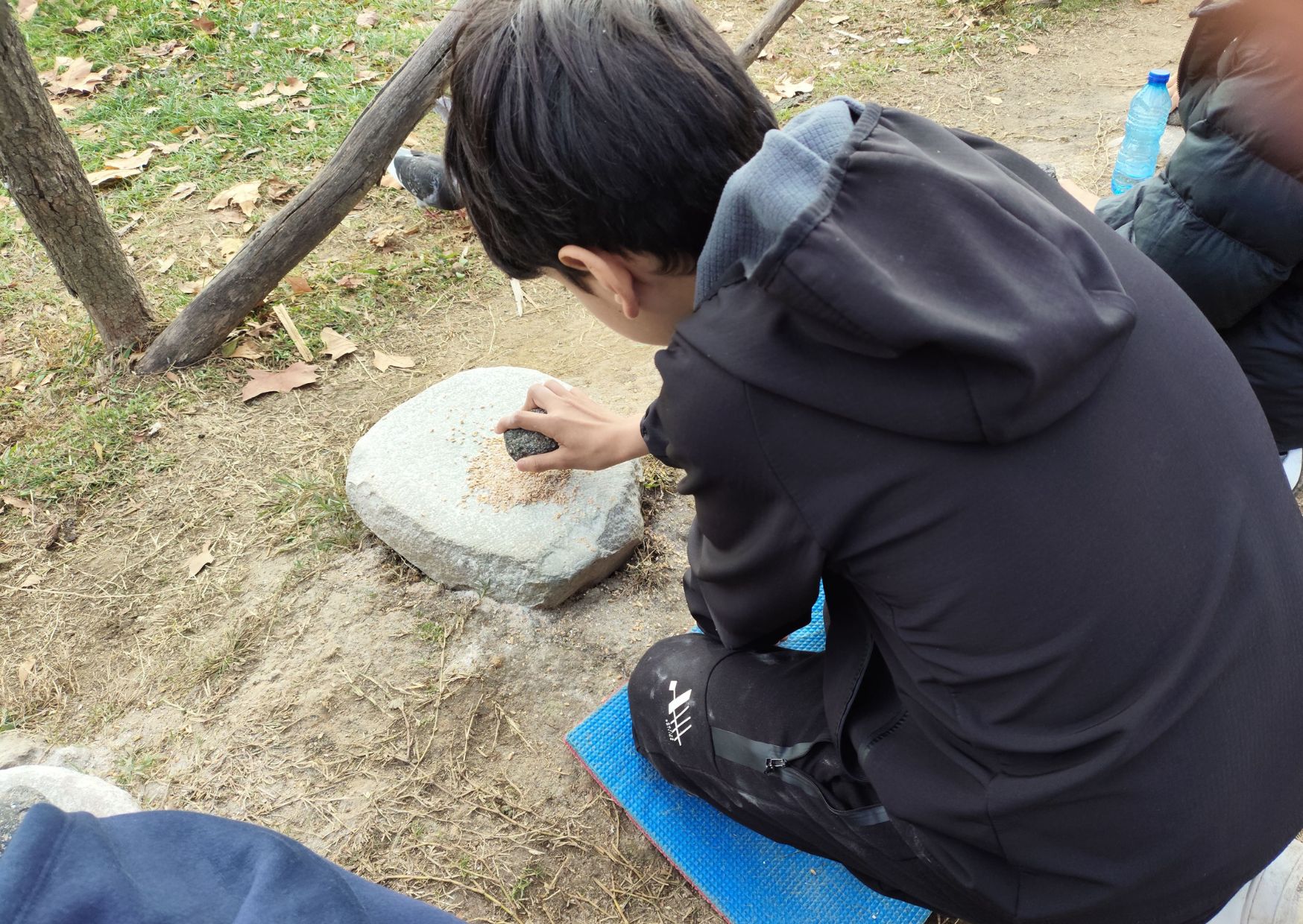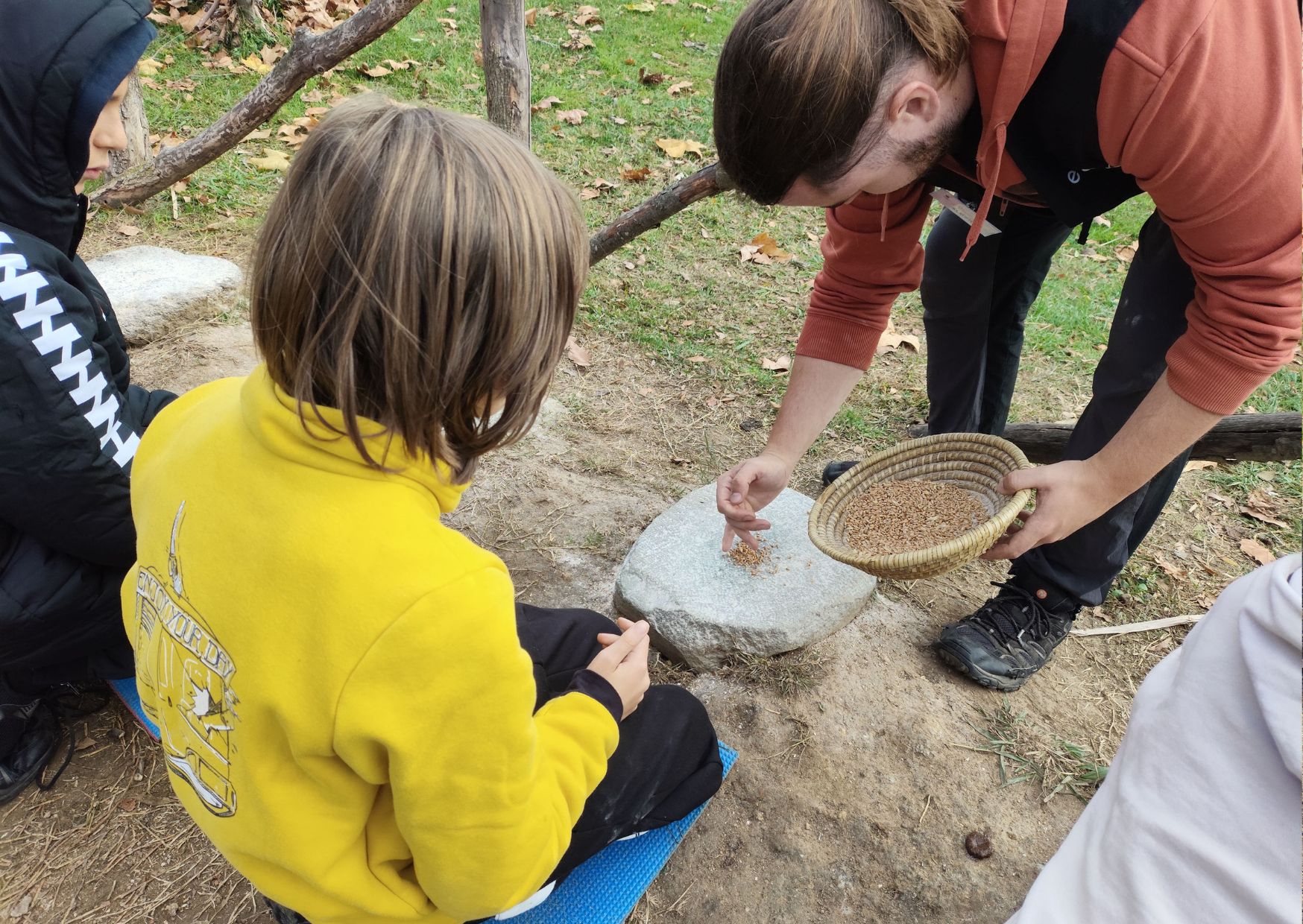 Seguidament, vam fer tres activitats diferents. Primer, vam fer farina amb blat, i la vam fer com la feien abans, amb una pedra a terra i una pedra a la mà fèiem pressió, i sortia farina. A l’altra activitat que vam realitzar, ens van ensenyar a llançar una llança, perquè abans utilitzaven llances per caçar animals. I a l’última activitat, vam muntar amb pedra, pals i cera, una llança. Nosaltres vam llimar la pedra perquè fos punxeguda i la vam enganxar amb cera. També ens van ensenyar com feien el foc abans.