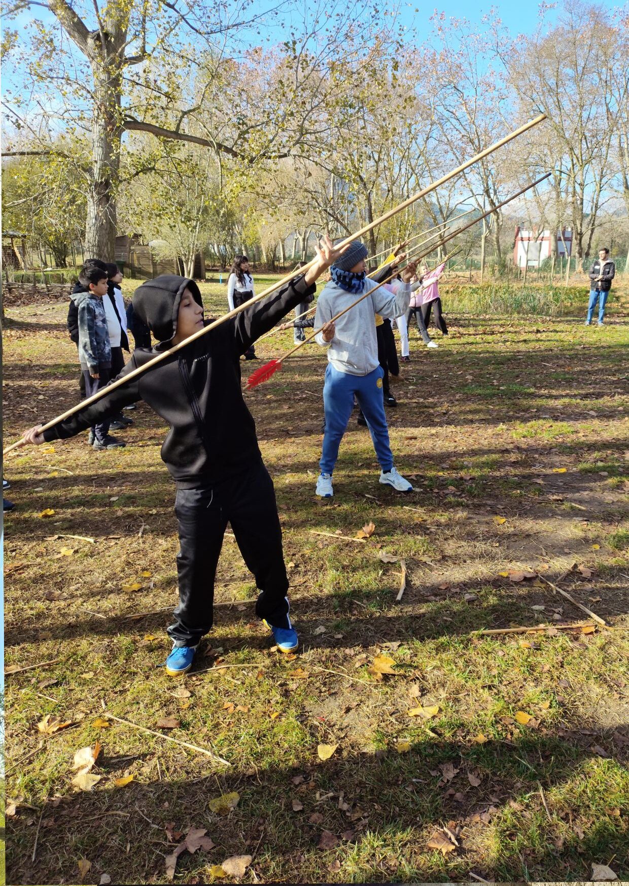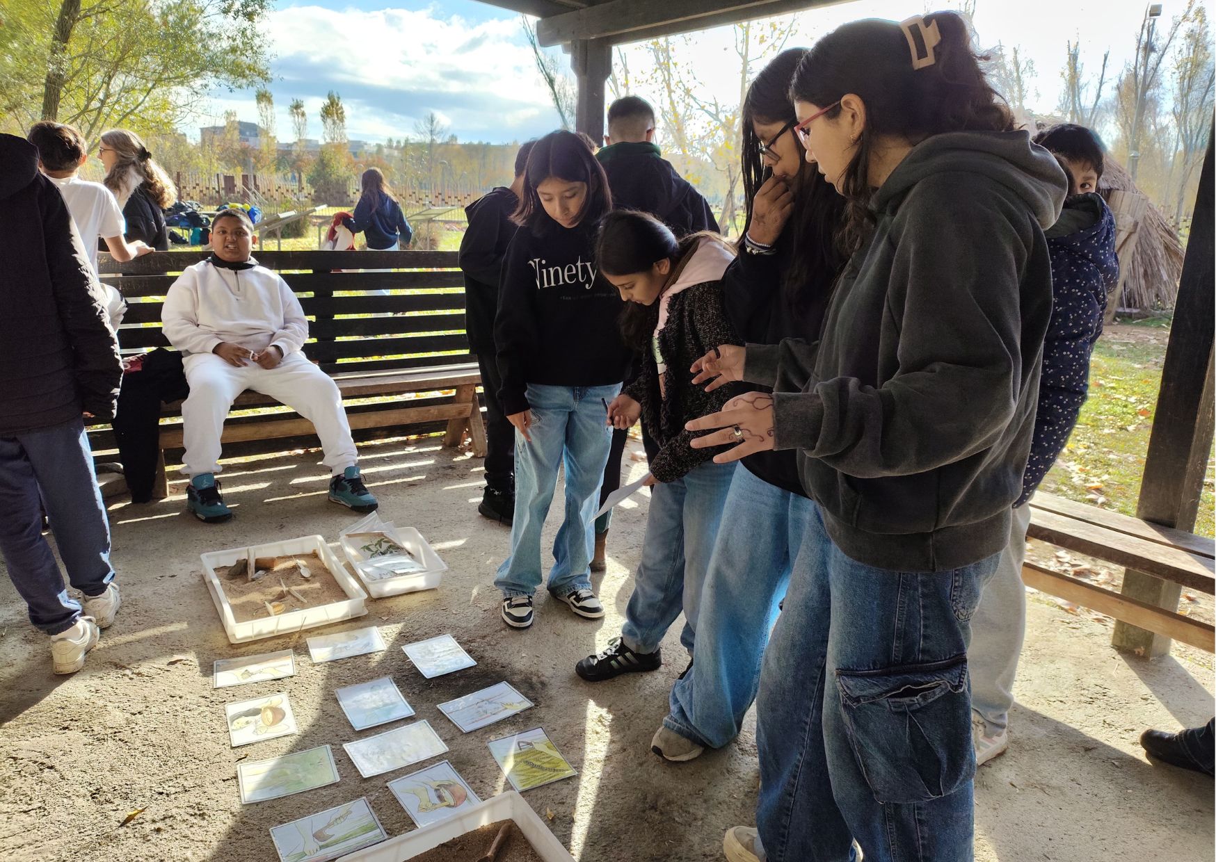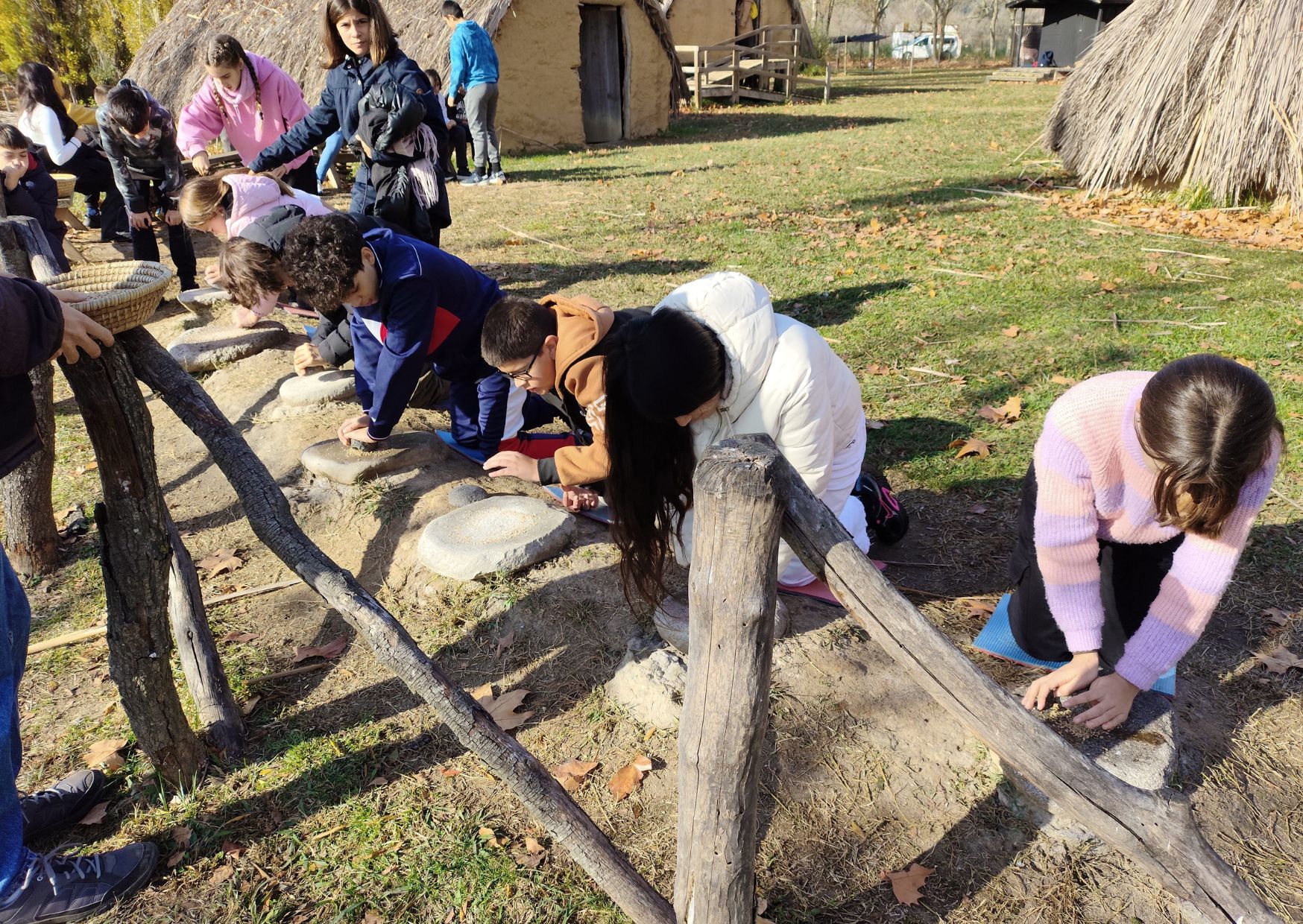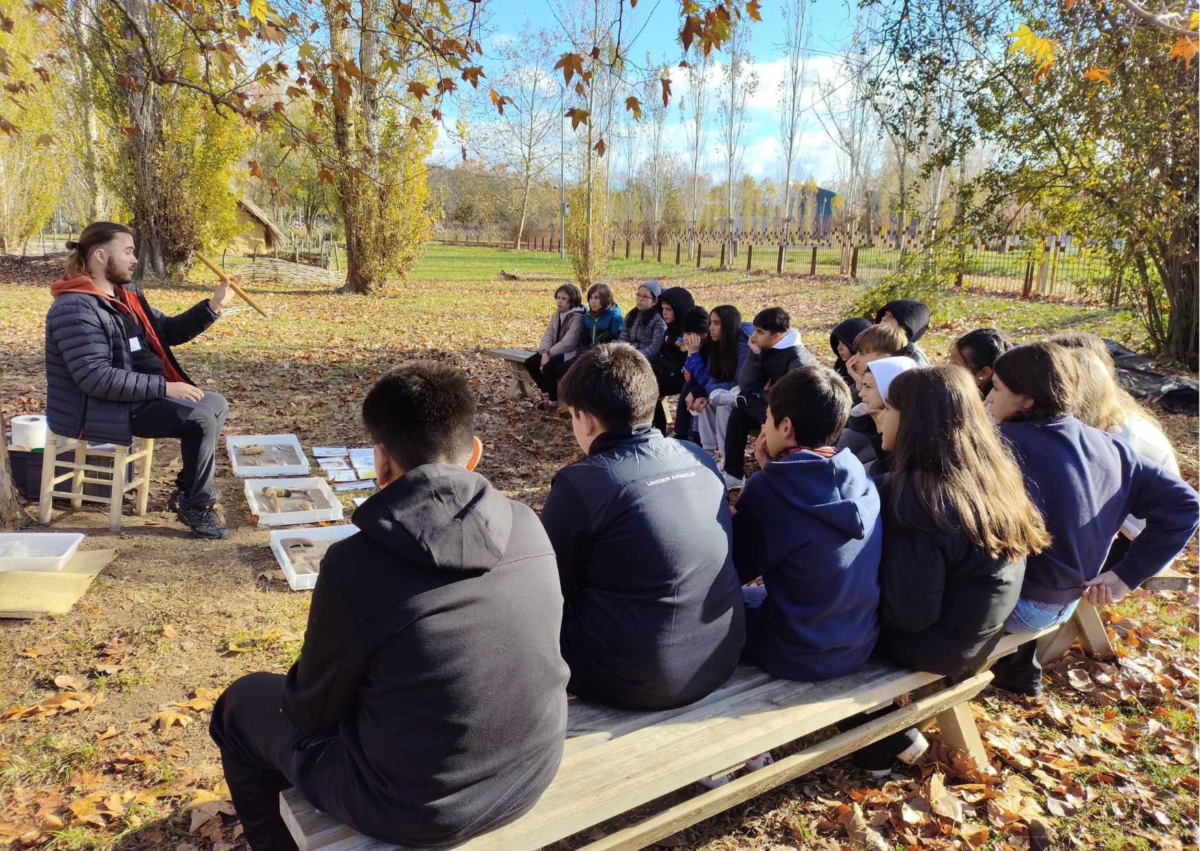 Estàvem tots molt contents, perquè ens feia il·lusió visitar aquest parc neolític. Vam arribar a les 9:45 allà, i vam esmorzar al costat d’un llac. Després vam dirigir-nos al parc on ens esperaven els professionals que ens farien les activitats, i ens vam distribuir en tres grups barrejats 1r A i 1r B.