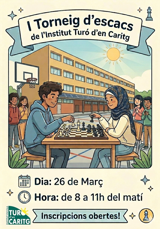 El dia 26 de Març tindrà lloc el 1r Torneig d’Escacs de l’IE Turó d’en Caritg! Els alumnes de l’ESO podran demostrar tot el que han après jugant contra tots els nivells i fins i tot professors. Molta sort a totes!