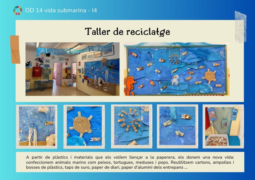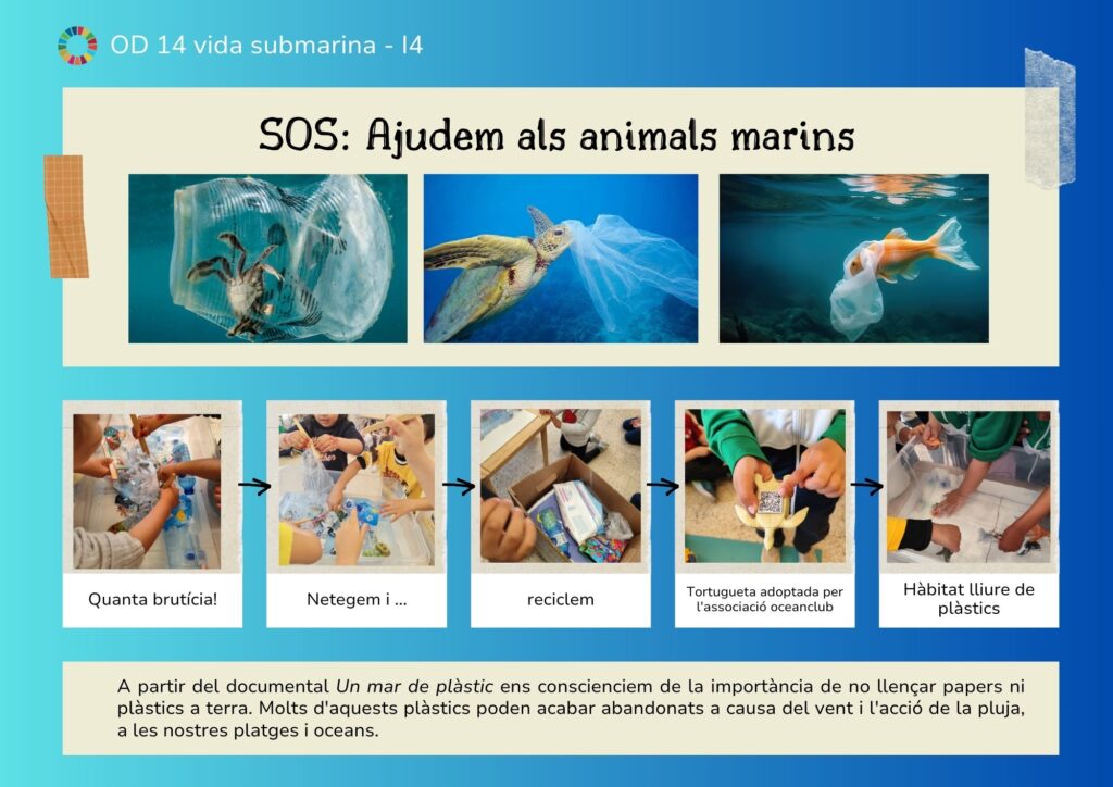 Els infants d’I4, hem conegut un dels Objectius de Desenvolupament Sostenible, en concret el número 14. A partir del documental Un mar de plàstic ens conscienciem de la importància de no llençar papers ni plàstics a terra. Molts d’aquests plàstics poden acabar abandonats a causa del vent i l’acció de la pluja, a les nostres platges i oceans. També hem realitzat un taller de reciclatge, reutilitzant plàstics i materials que ens vam trobar a les escombraries de reciclatge de l’escola.
