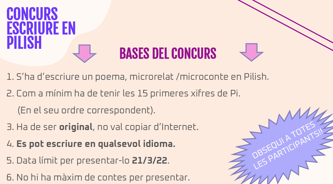Finalment, vàrem parlar sobre el “Pilish”, és a dir, l’estil d’escriptura en el qual cada paraula té tantes lletres com indica la xifra corresponent de pi, i vàrem presentar el següent concurs per tal de motivar a les estudiants.