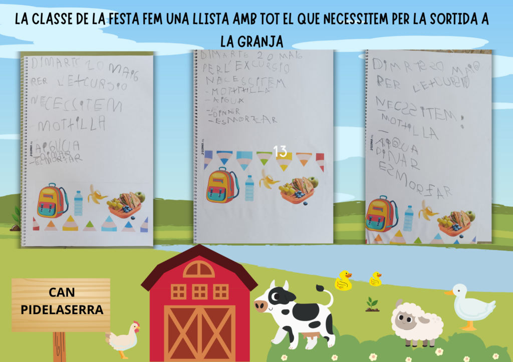 ARA ESCRIC MAIG. CLASSES DE L’ARC DE SANT MARTÍ I DE LA FESTA Cicle Petits11/06/25 Hola famílies! Les classes de l’Arc de Sant Martí i de la Festa practiquem l’escriptura fent una llista del més important que hem de portar per l’excursió a la Granja. Endavant!