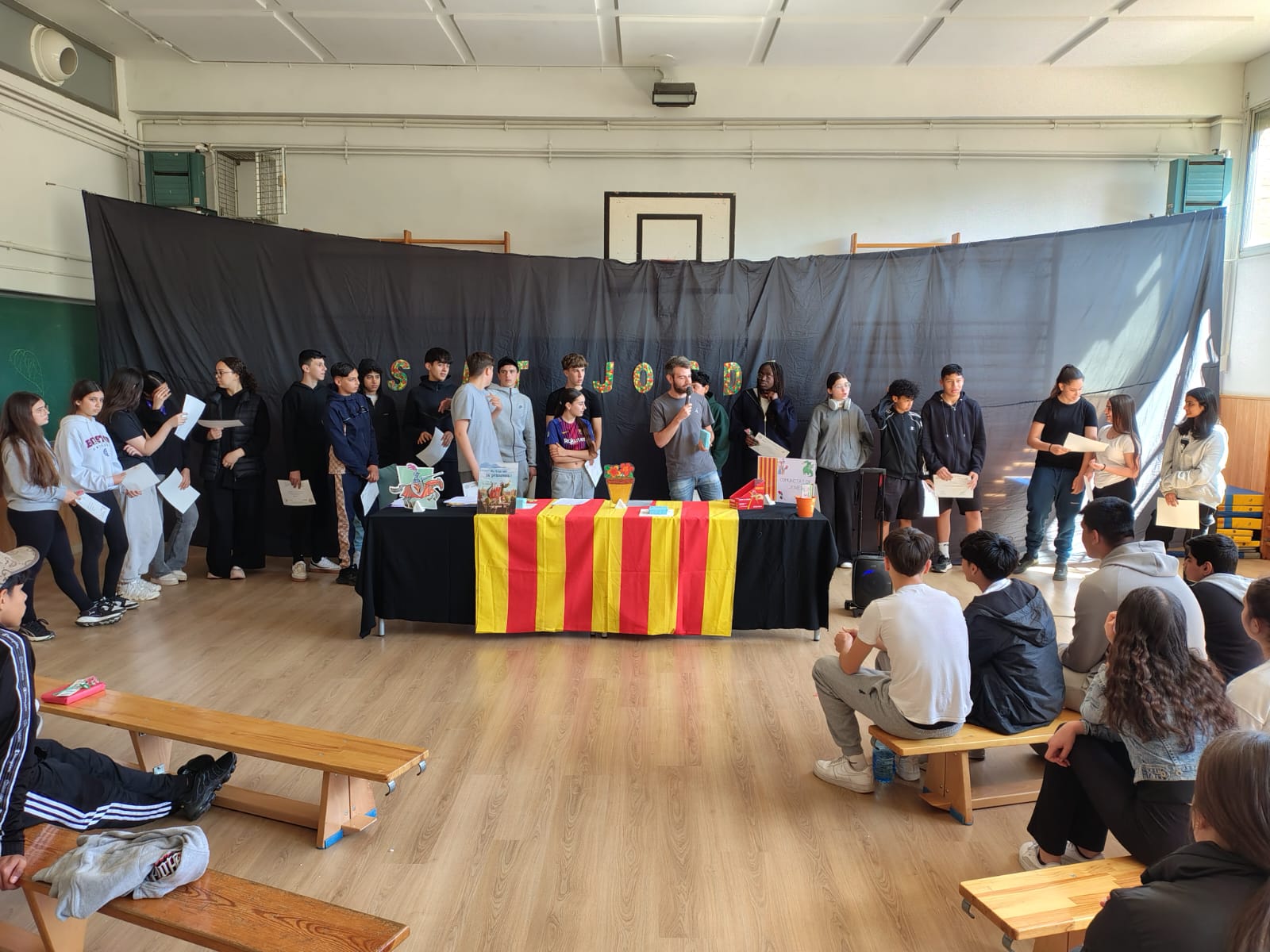 El gran protagonista ha estat, sens dubte, el concurs literari. Enguany, la temàtica escollida ha estat el cinema, i els alumnes han presentat poemes inspirats en diferents gèneres: des de històries romàntiques fins a homenatges al cinema clàssic. L’acte central, conduït pel professor Dani Peiró Egea, ha reunit l’alumnat de 3r i 4t d’ESO a la sala d’actes en un ambient ple de nervis i expectació. Aplaudiments, crits d’ànim i lectures plenes d’emoció han fet d’aquest moment una autèntica celebració del talent jove.
