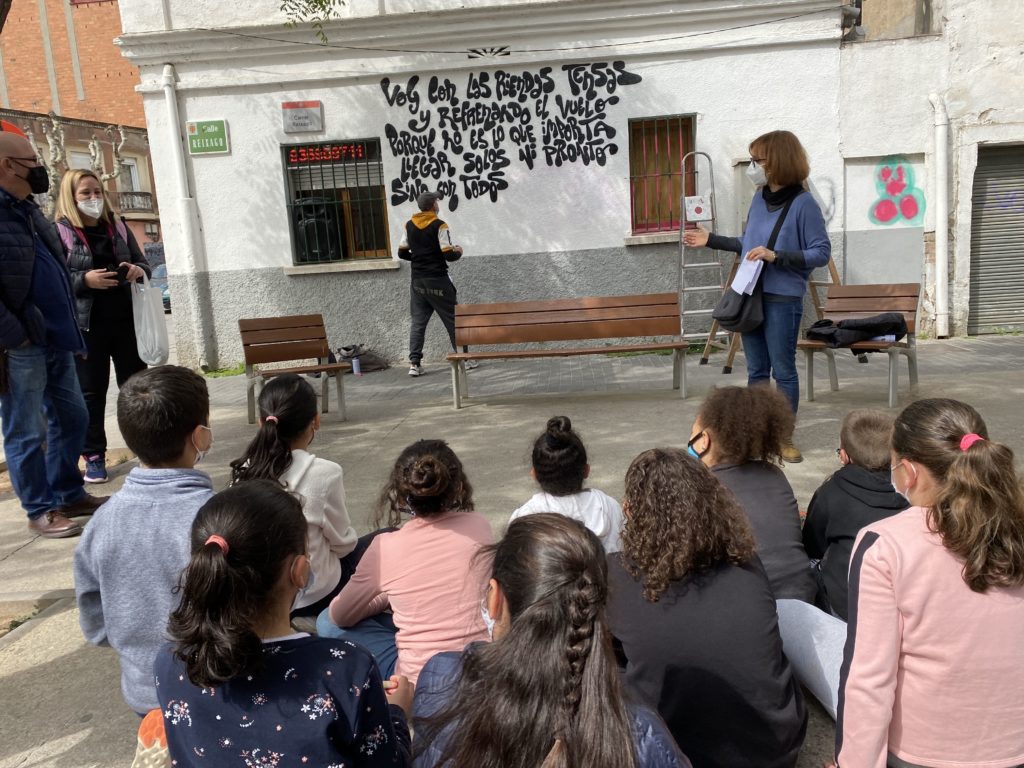 Fas uns dies vam poder anar a veure com el Paco feia un grafiti a les parets del nostre barri. Un cop allà vam estar observant el seu talent i lo meravellós que és l’art. Vam llegir el grafiti i vam parlar del seu significat. A més a més, ens van explicar què s’ha de fer per poder fer un grafiti a un lloc públic. També vam parlar de les moltes pintades que hi ha per les parets i de la falta de respecte que això suposa per tots els ciutadans. Un cop tractat aquest tema, el Paco ens va deixar ajudar-lo a borrar una pintada que hi havia a la paret just del costat del seu grafiti.