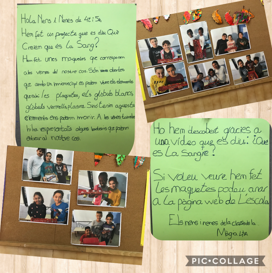 Al passadís dels Grans hem exposat les fotografies de les nostres maquetes de la sang i una petita explicació perquè tothom sàpiga què hem fet. En aquesta pàgina web hi ha també una entrada on vam penjar el vídeo on expliquem com les hem fet. Podeu veure-les clicant aquí https://agora.xtec.cat/ieviver/portada/la-sang-maquetes-de-la-classe-de-la-magia-4t-a/