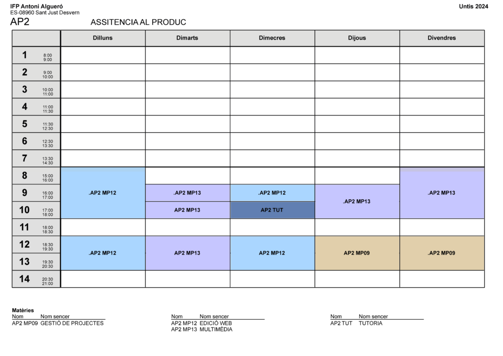 Horari CFAM Assistència la producte gràfic interactiu 2n curs (AP2)