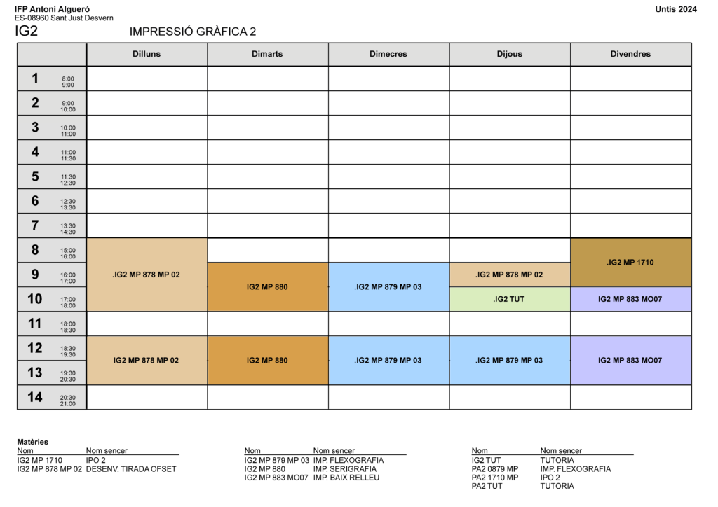 Horari CFPM Impressió gràfica 2n curs (IG2)