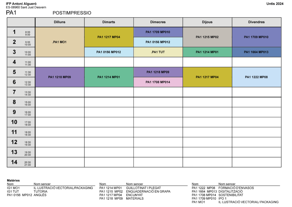 Horari CFPM Postimpressió i acabats gràfics 1r curs (PA1)