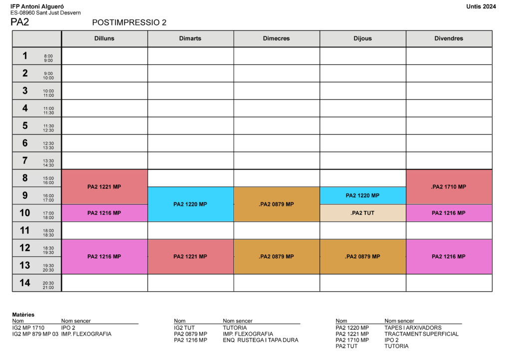 Horari CFPM Postimpressió i acabats gràfics 2n curs (PA2)