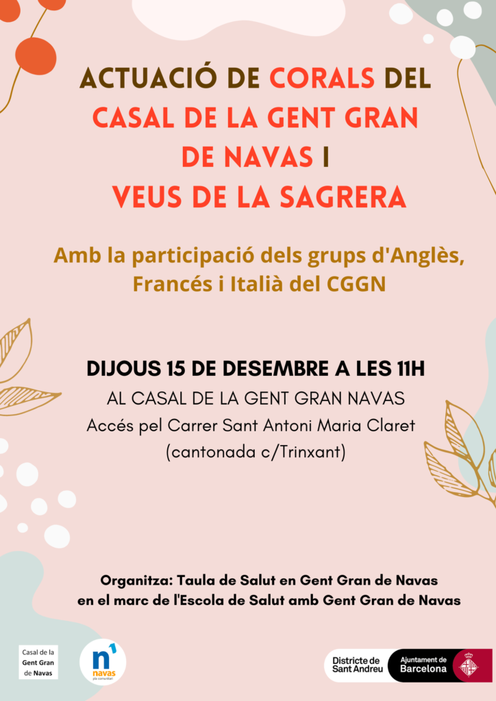 Demà dijous 15 a partir de les 11h al Casal de la Gent Gran de Navas podreu gaudir de l’actuació de la coral del mateix Casal i la coral Veus de la Sagrera. A més hi participaran també els grups d’idiomes del Casal que cantaran nadales en anglès, francès i italià.