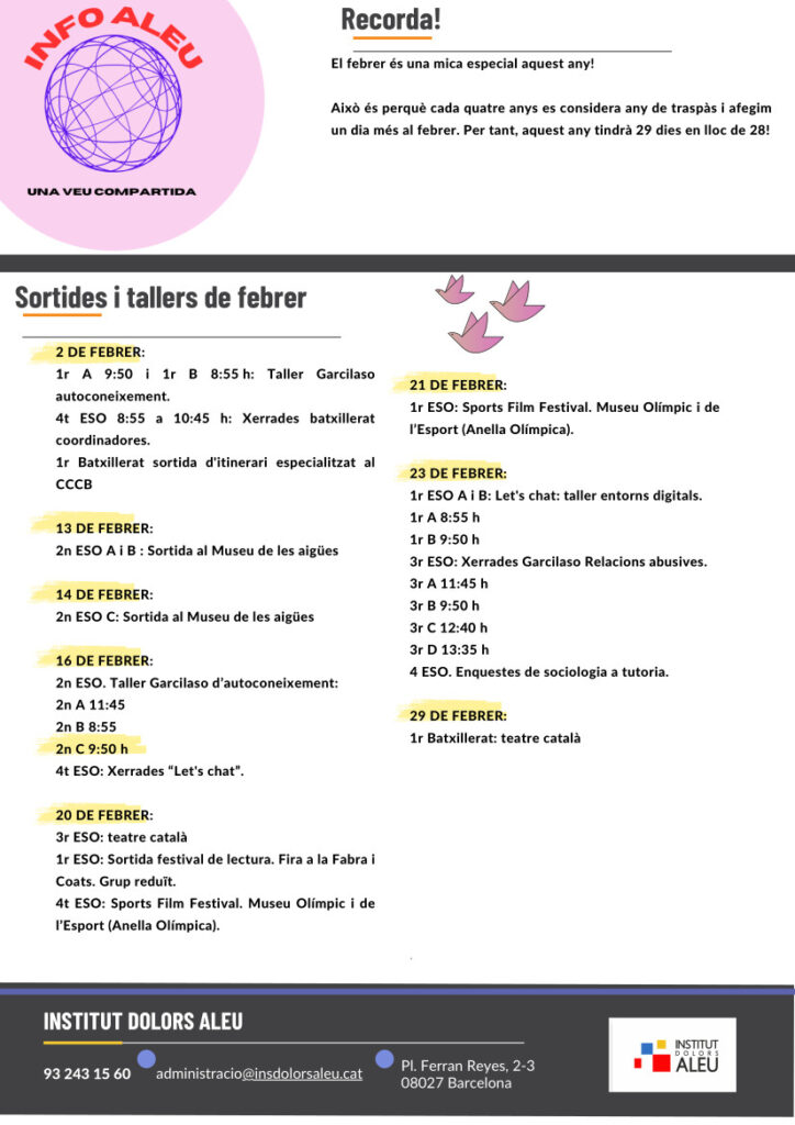 Aquí teniu el butlletí InfoAleu corresponent al mes de febrer de 2024. Tots els butlletins també els podreu trobar cada mes a través de les nostres xarxes socials i les famílies de l’alumnat de l’Institut el rebreu directament a través d’ENSE.
