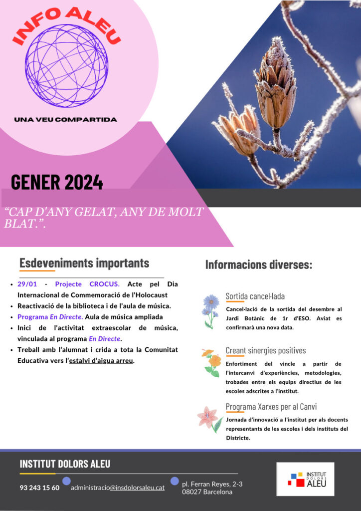 Aquí teniu el butlletí InfoAleu corresponent al mes de gener de 2024. Tots els butlletins també els podreu trobar cada mes a través de les nostres xarxes socials i les famílies de l’alumnat de l’Institut el rebreu directament a través d’ENSE.