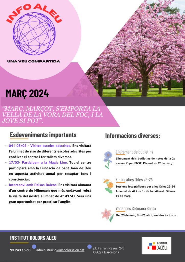 Com cada inici de mes, avui us portem el butlletí InfoAleu corresponent al mes de març de 2024. Tots els butlletins també els podreu trobar cada mes a través de les nostres xarxes socials i les famílies de l’alumnat de l’Institut el rebreu directament a través d’ENSE.