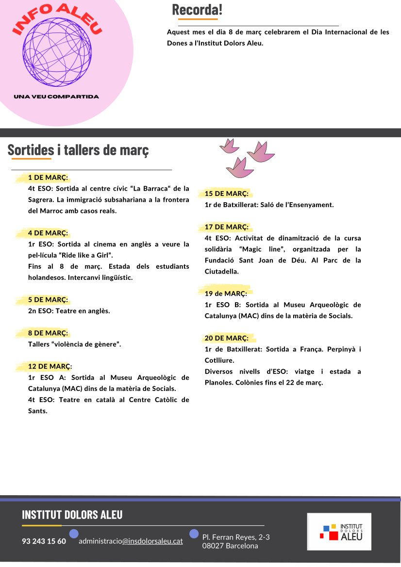 Com cada inici de mes, avui us portem el butlletí InfoAleu corresponent al mes de març de 2024. Tots els butlletins també els podreu trobar cada mes a través de les nostres xarxes socials i les famílies de l’alumnat de l’Institut el rebreu directament a través d’ENSE.
