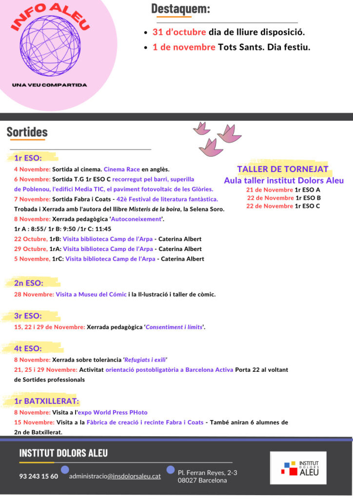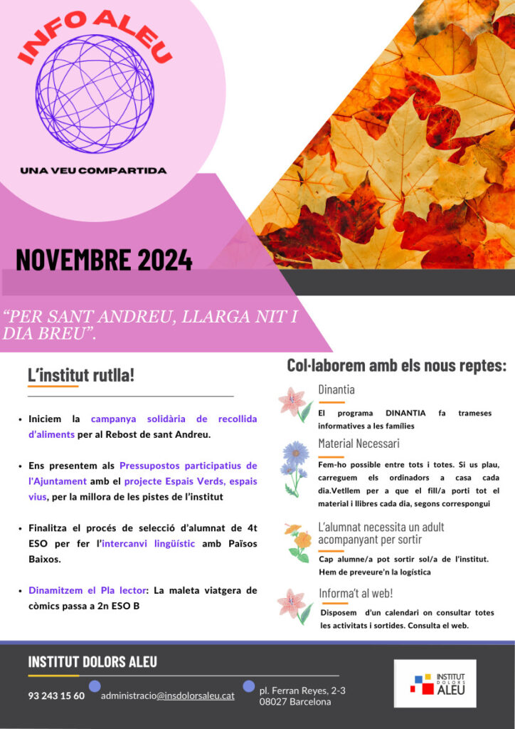 Avui publiquem el butlletí InfoAleu corresponent al mes de novembre de 2024. Tots els butlletins també els podreu trobar cada mes a través de les nostres xarxes socials i les famílies de l’alumnat de l’Institut el rebreu directament a través de Dinantia.