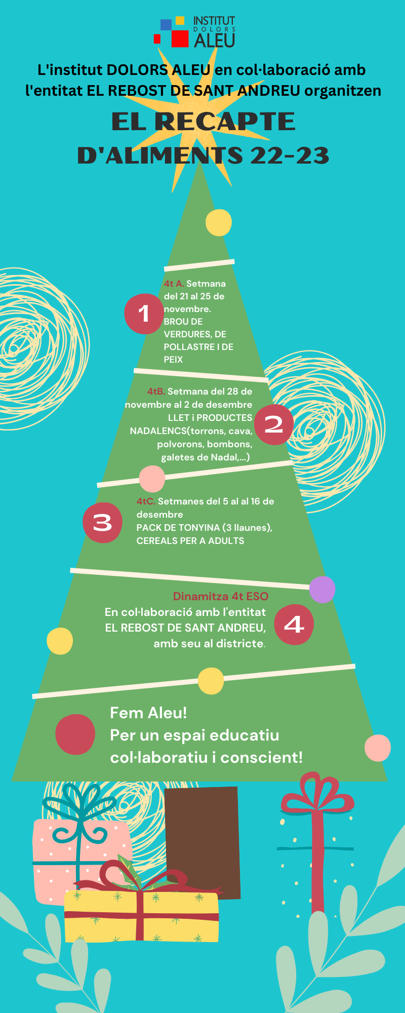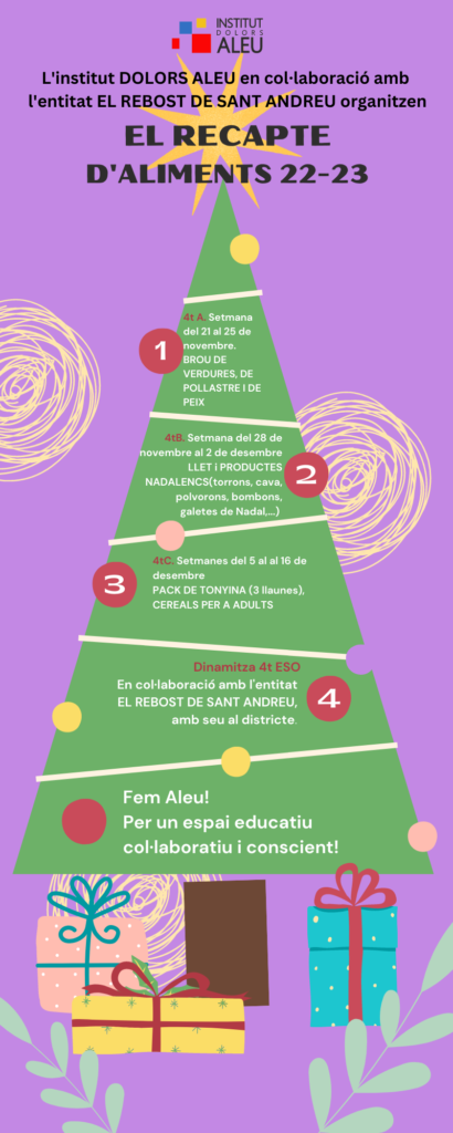 La campanya va adreçada a tota la comunitat educativa i la recollida d’aliments es farà al llarg d’aquestes properes quatre setmanes, des d’avui i fins al 16 de desembre. Tots els aliments que recaptem els portarem al Rebost de Sant Andreu, una entitat del districte que treballa des de fa molts anys per ajudar la gent que ho més ho necessita. Fem una crida a aportar els aliments que des del Rebost ens aniran demanant cada setmana. Fem Aleu!