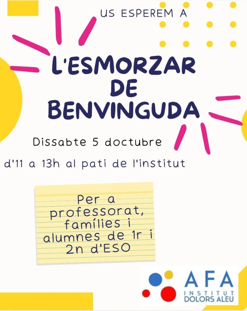 Aquest proper dissabte 5 d’octubre, a partir de les 11h i fins les 13h, l’AFA organitza l’esmorzar de benvinguda per a les famílies de 1r i 2n d’ESO al pati de l’Institut. Famílies, alumnes i tot el personal de l’Institut hi estem convidats. Us hi esperem! Fem Aleu!