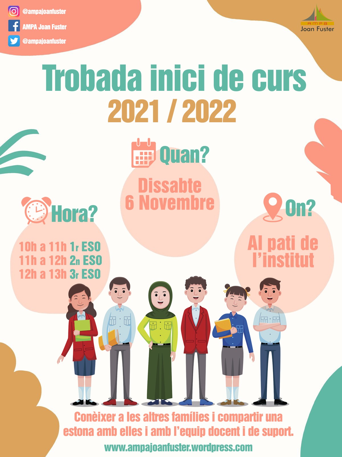 Els i les alumnes de 4t d’ESO al projecte d’Aprenentatge i Servei Comunitari ofereixen a les famílies de l’Institut Joan Fuster formació bàsica d’informàtica per poder resoldre i gestionar tràmits del dia a dia. Podeu trobar més informació aquí i també aquest dissabte 6 a la trobada d’inici de curs que organitza l’AMPA amb el següent horari: