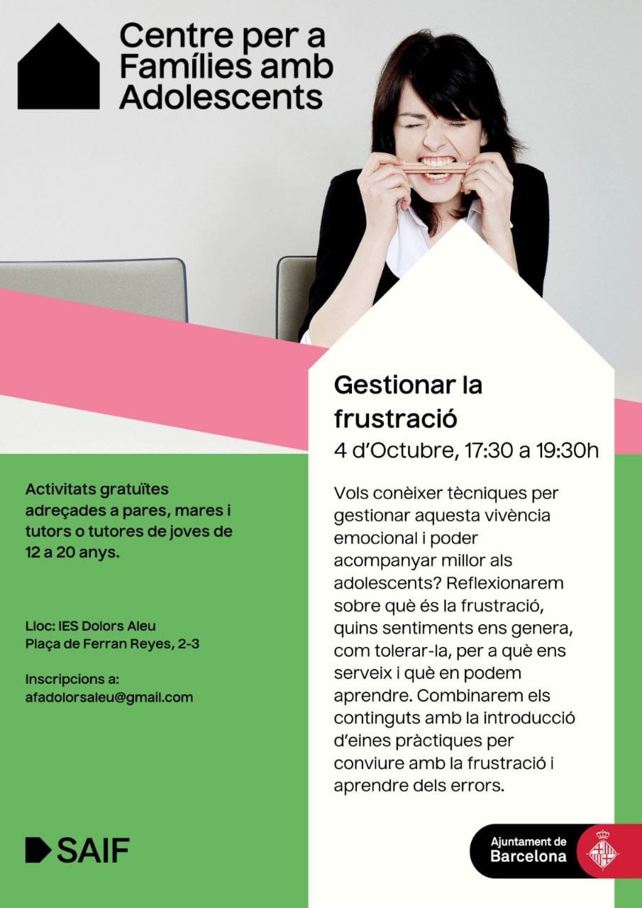 Demà dimecres 4 d’octubre podreu assistir a l’activitat “Gestionar la frustració” organitzada per l’AFA Dolors Aleu i que tindrà lloc a les instal·lacions de l’Institut a partir de dos quarts de sis de la tarda. Us hi podeu inscriure gratuïtament enviat un missatge a l’adreça afadolorsaleu@gmail.com.