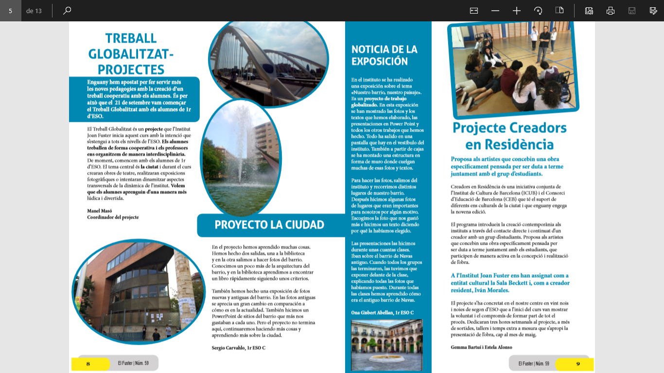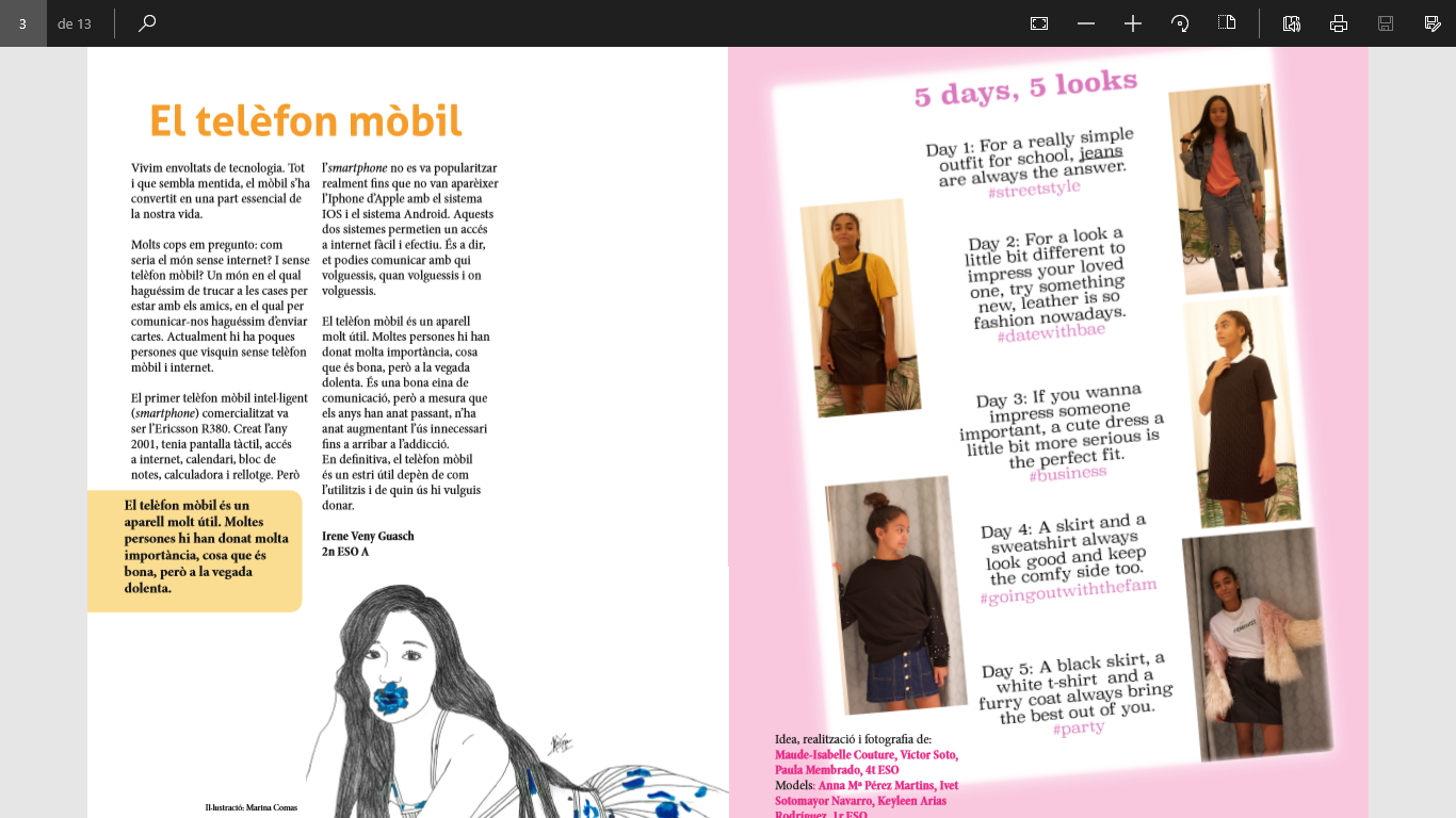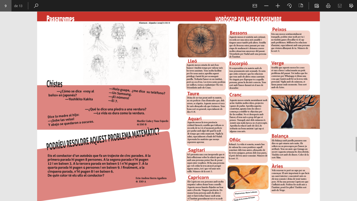 En aquest número hem treballat de valent per millorar cada cop més. A la Revista hi trobareu texts escrits en català, castellà, anglès i francès i seccions de tot tipus: opinió, moda, notícies del centre, relats, les fotos dels nous alumnes de 1r d’ESO, informació de l’AMPA, curiositats, passatemps, recomanacions, espais creatius… La Revista és un espai obert a la innovació, a la creació i a l’expressió de les idees i els pensaments dels alumnes, professorat i pares. És un lloc on volem crear les llavors d’una societat més justa, dinàmica i creadora.