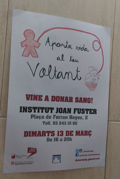JORNADA DE DONACIÓ DE SANG admin14/03/18 Es va a celebrar el dimarts, 13 de març, la Jornada de Donació de Sang. Els alumnes de 4t d’ESO van col.laborar des de les 4 fins a les 8 de la tarda. Aquí tenim algunes fotos: