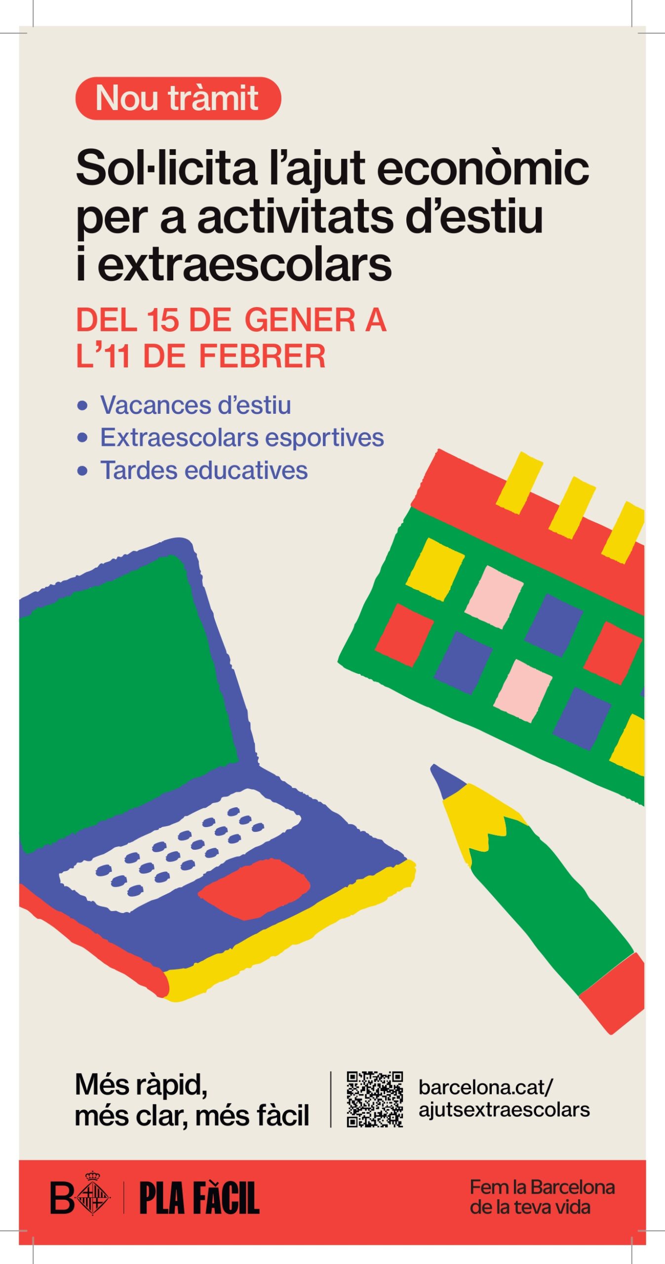 A l’apartat Famílies > Beques i ajuts > Ajuts econòmics per a activitats d’estiu i extraescolars trobareu el detall del nou procediment, el calendari i els requisits per fer la sol·licitud única del nivell d’ajut, que s’haurà de presentar entre el 15 de gener i l’11 de febrer de 2026. Podeu consultar també tota la informació relativa a aquest tràmit, així com tramitar-lo, directament al web de l’Ajuntament de Barcelona: https://ajuntament.barcelona.cat/ajutsextraescolars/ca